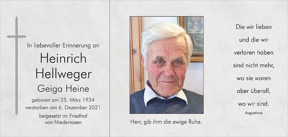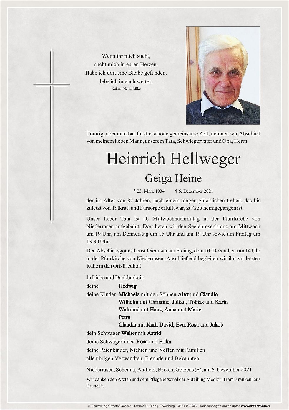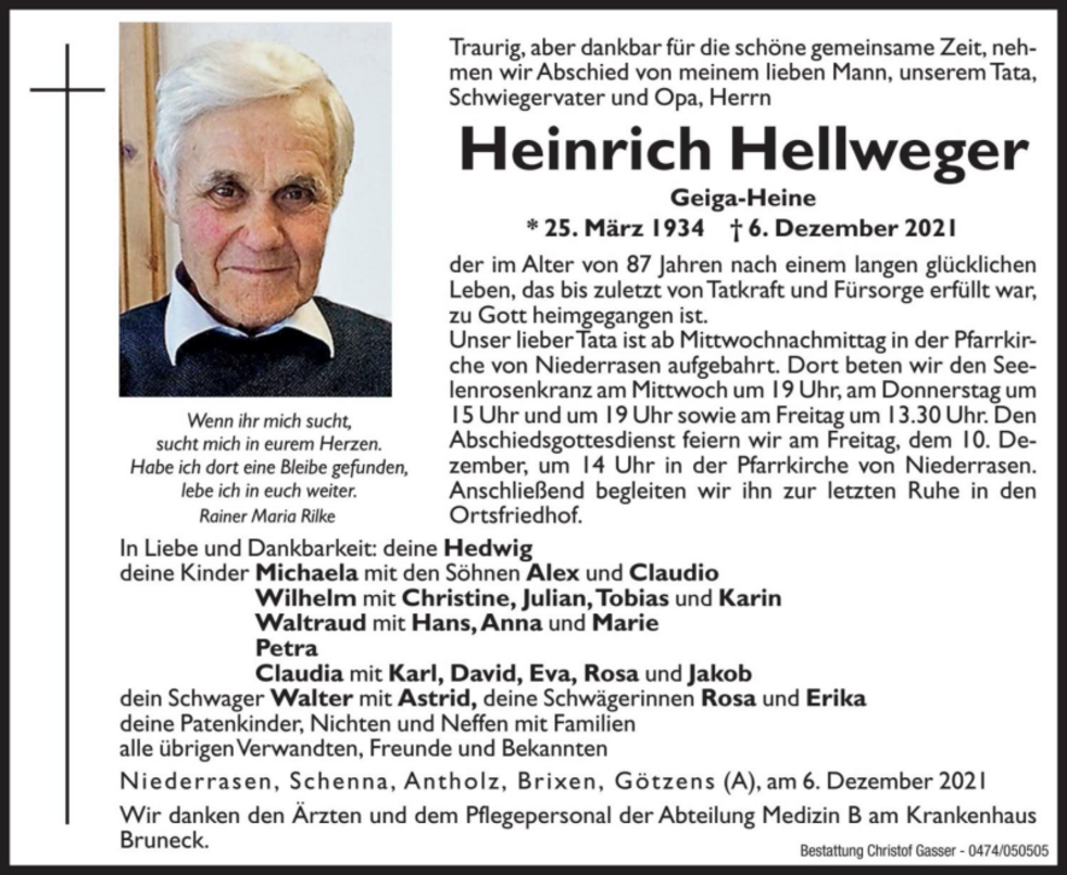 Den Abschiedsgottesdienst feiern wir am Freitag, dem 10. Dezember, um 14 Uhr in der Pfarrkirche von Niederrasen. Anschließend begleiten wir ihn zur letzten Ruhe in den Ortsfriedhof.