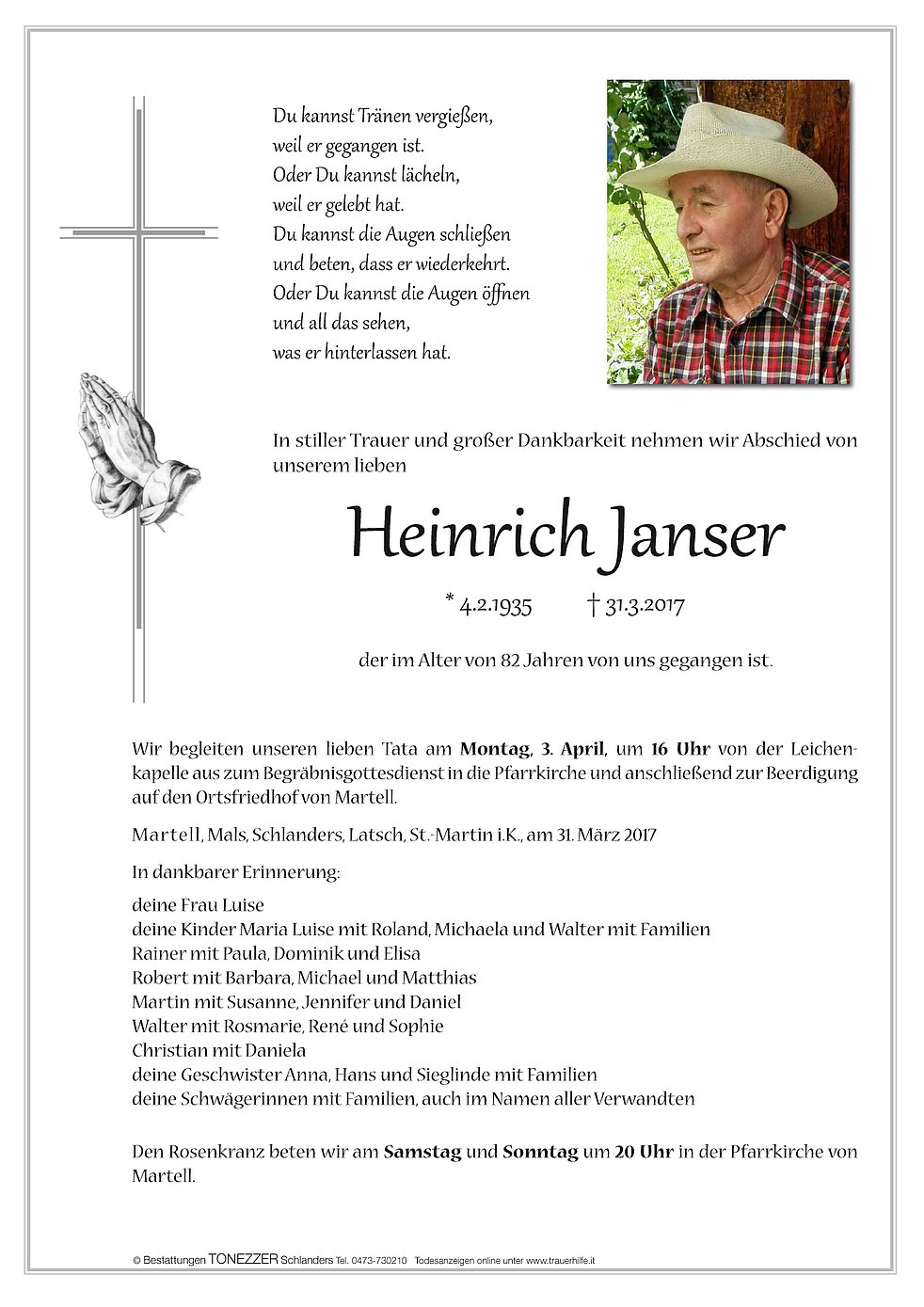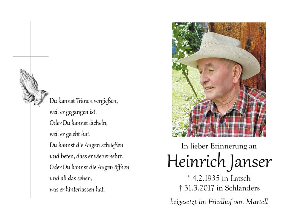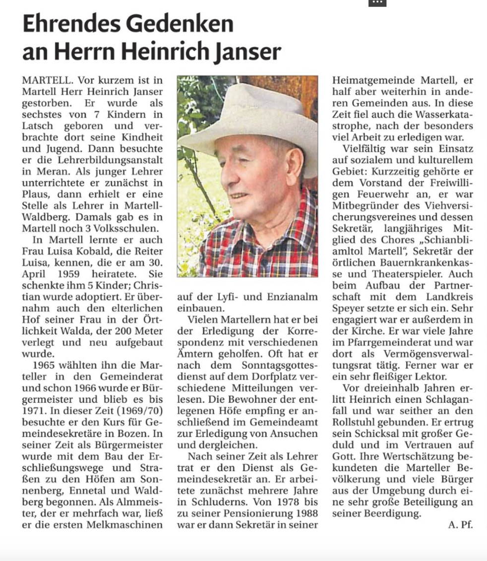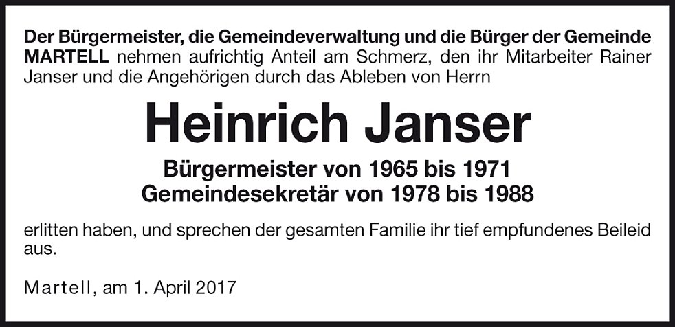 Wir begleiten unseren lieben Tata am Montag, 3. April, um 16 Uhr von der Leichenkapelle aus zum Begräbnisgottesdienst in die Pfarrkirche und anschließend zur Beerdigung auf den Ortsfriedhof von Martell.