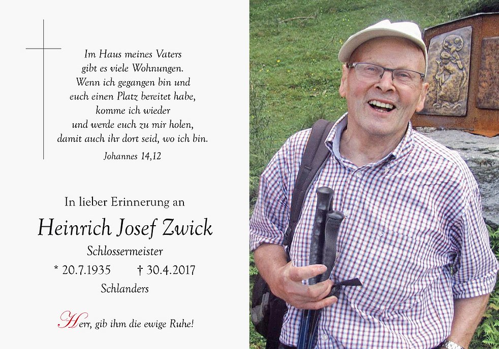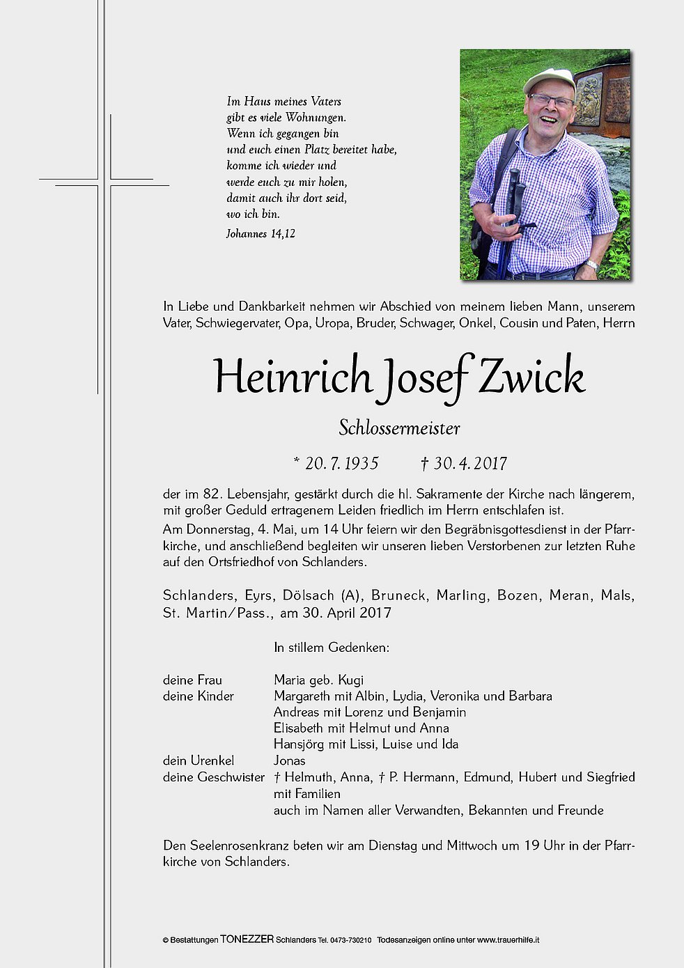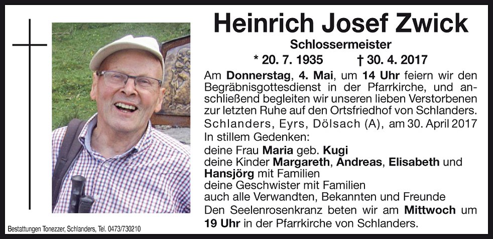 Am Donnerstag, 4. Mai, um 14 Uhr feiern wir den Begräbnisgottesdienst in der Pfarrkirche, und anschließend begleiten wir unseren lieben Verstorbenen zur letzten Ruhe auf den Ortsfriedhof von Schlanders.