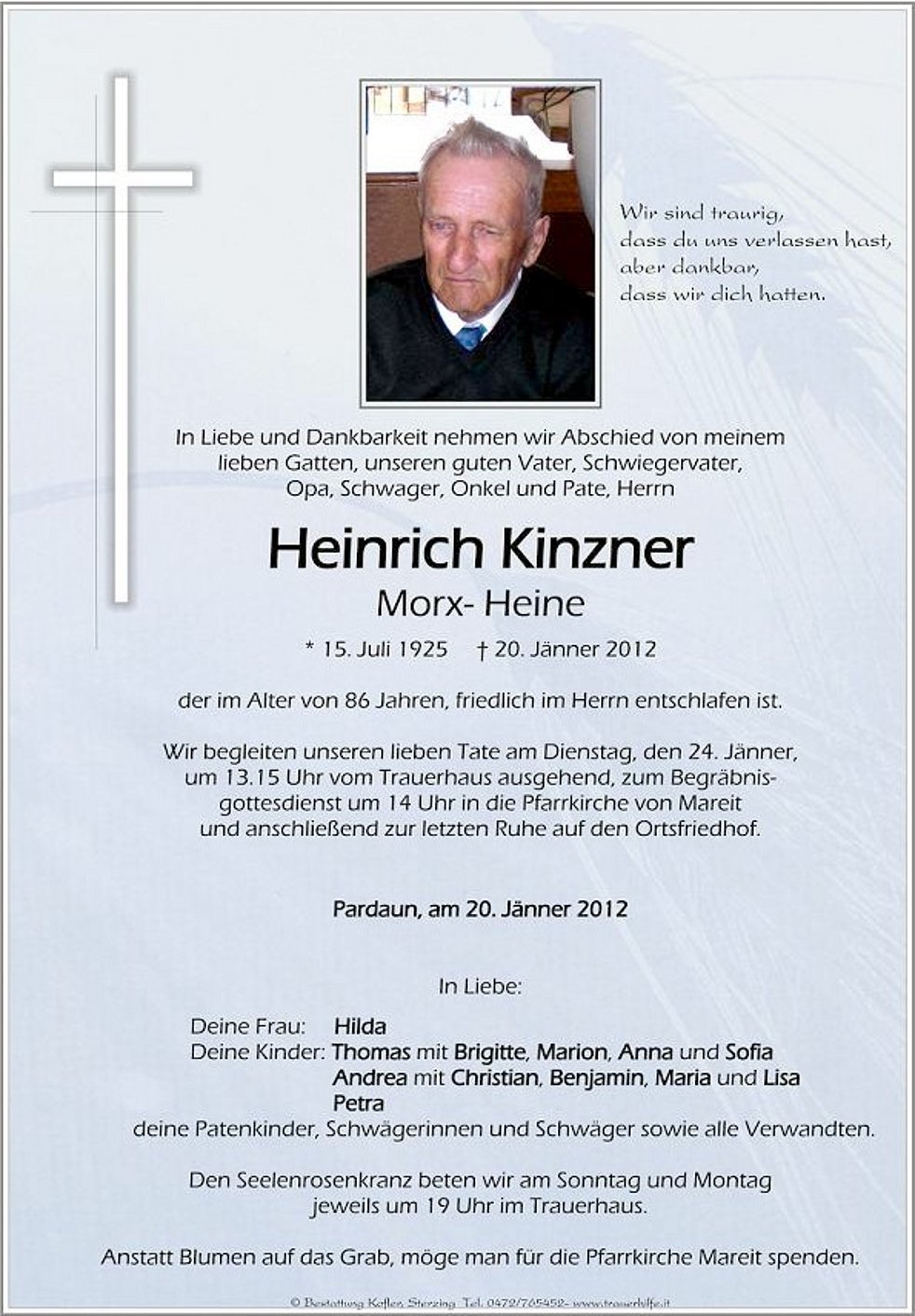 Anstatt Blumen auf das Grab, möge man für die Pfarrkirche Mareit spenden.