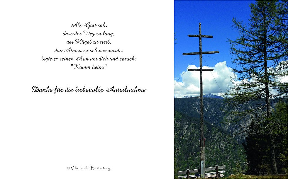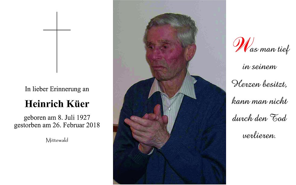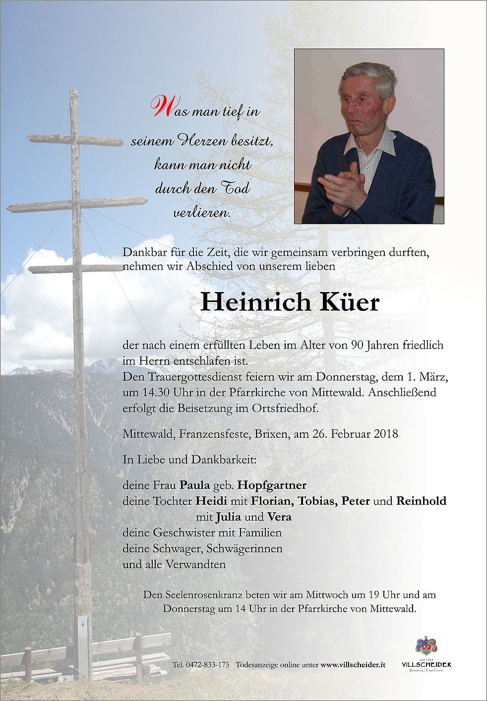 Den Trauergottesdienst feiern wir am Donnerstag, dem 1. März, um 14.30 Uhr in der Pfarrkirche von Mittewald. Anschließend erfolgt die Beisetzung im Ortsfriedhof.