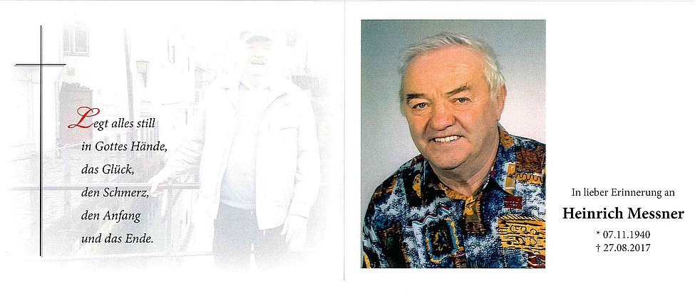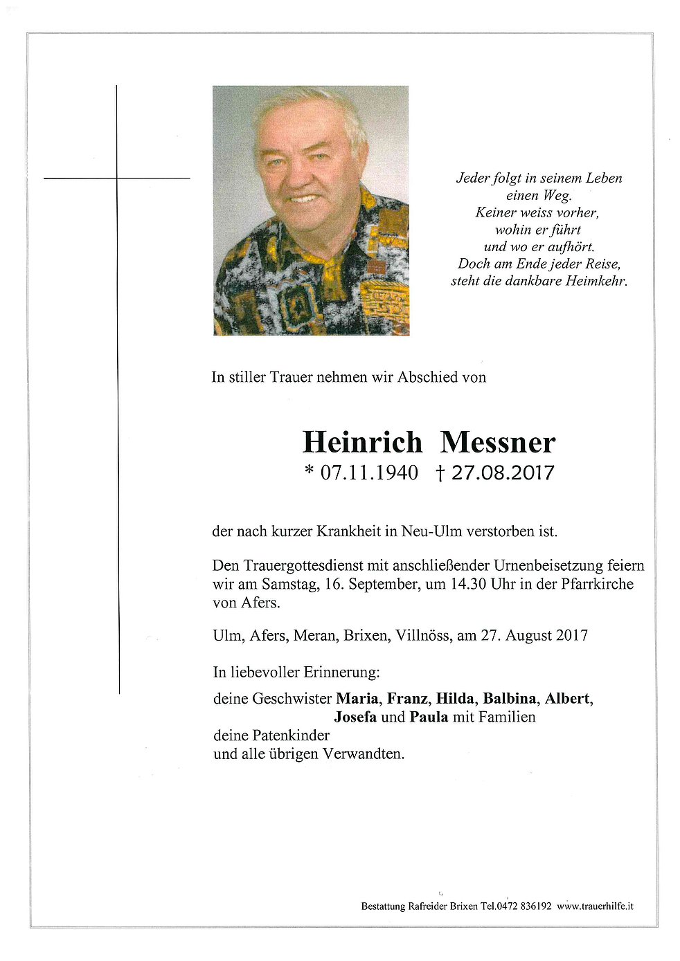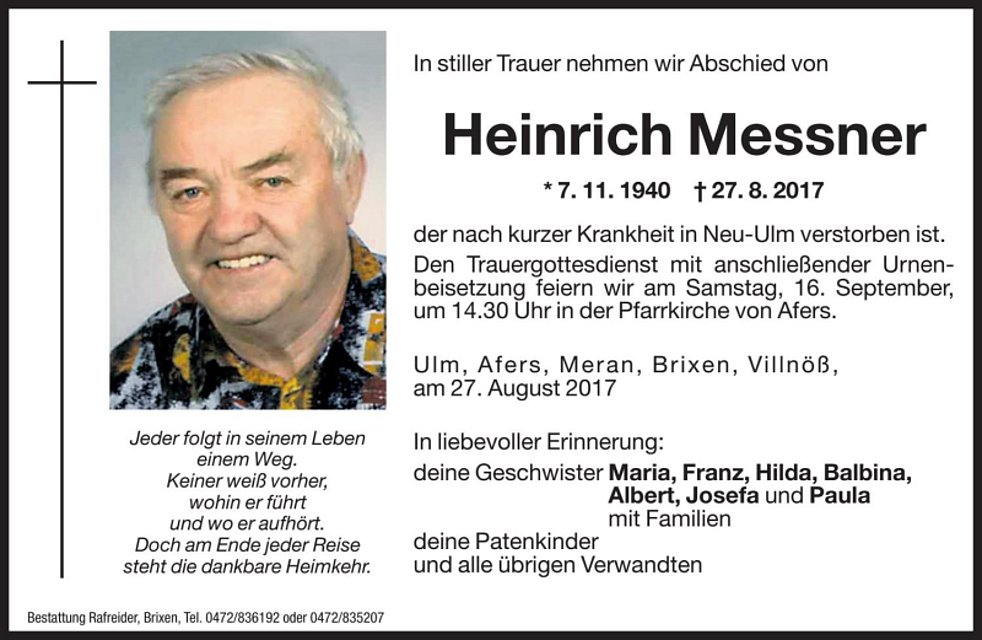 Den Trauergottesdienst mit anschließender Urnenbeisetzung feiern wir am Samstag, 16. September, um 14.30 Uhr in der Pfarrkirche von Afers.