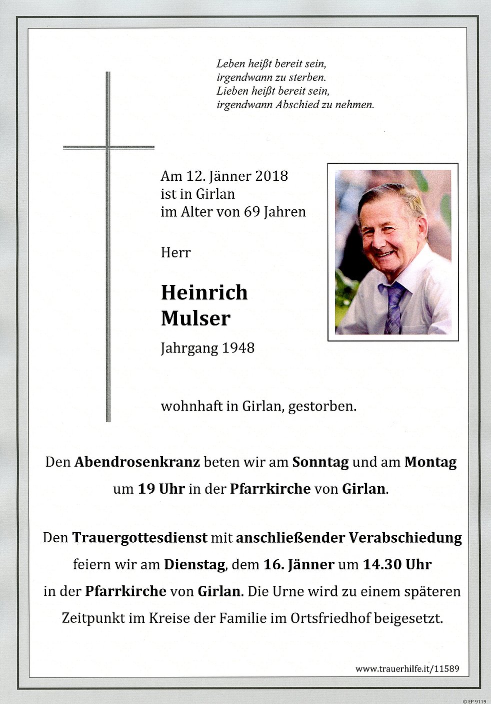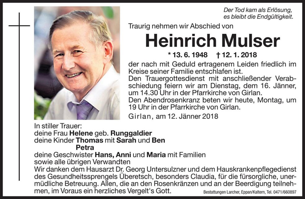Den Trauergottesdienst mit anschließender Verabschiedung feiern wir am Dienstag, dem 16. Jänner um 14.30 Uhr in der Pfarrkirche von Girlan.