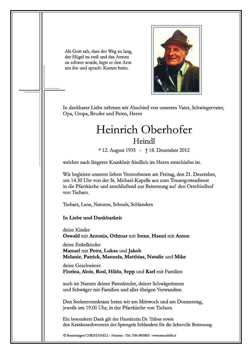Wir begleiten unseren lieben Verstorbenen am Freitag, den 21. Dezember, um 14.30 Uhr von der St. Michael-Kapelle aus zum Trauergottesdienst in die Pfarrkirche und anschließend zur Beisetzung auf den Ortsfriedhof von Tschars.