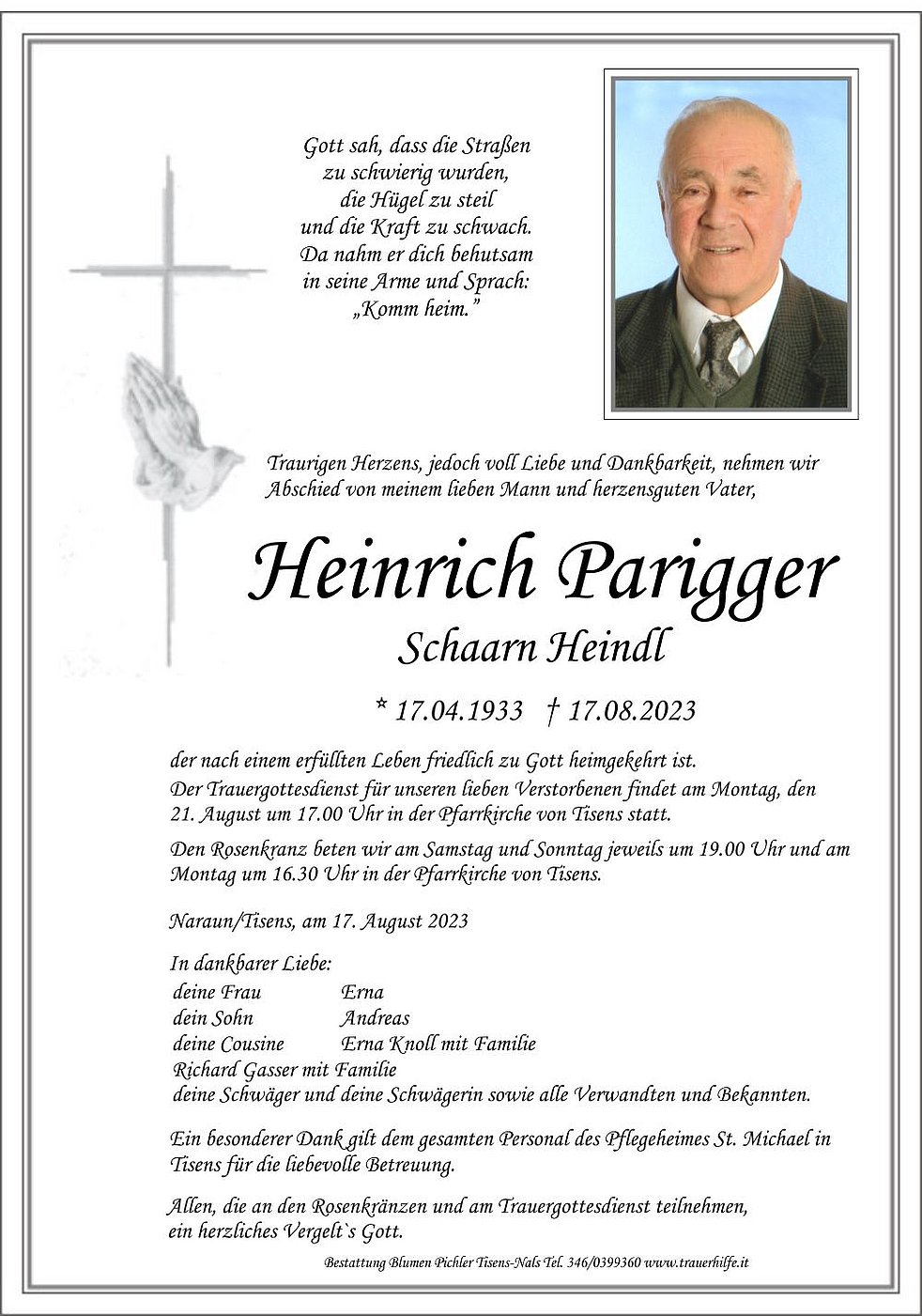 Trauerfeier: 21.08. - 17:00 Uhr Pfarrkirche Tisens