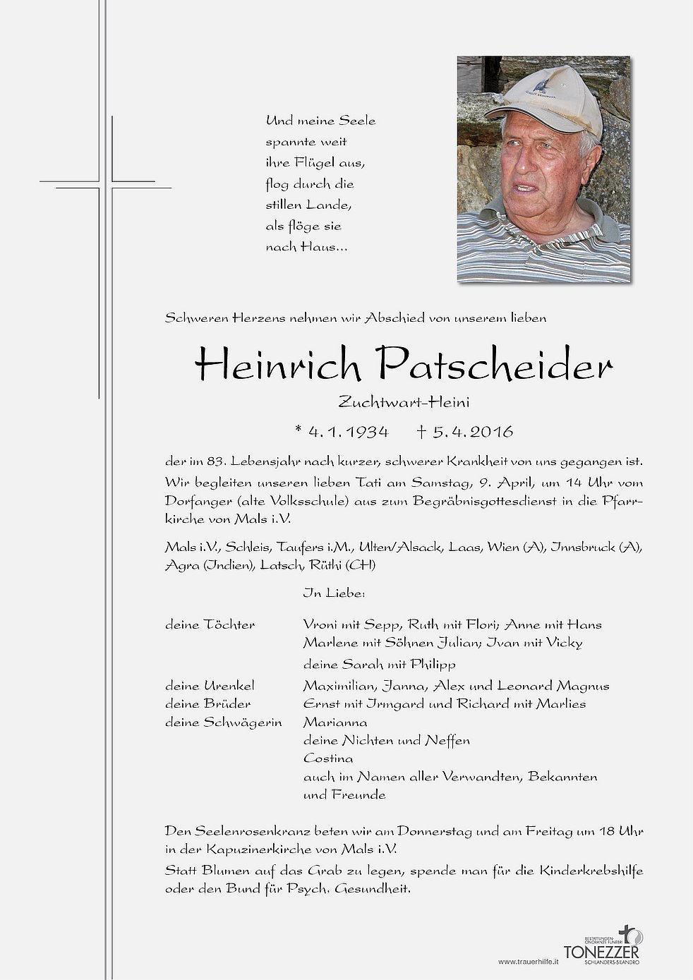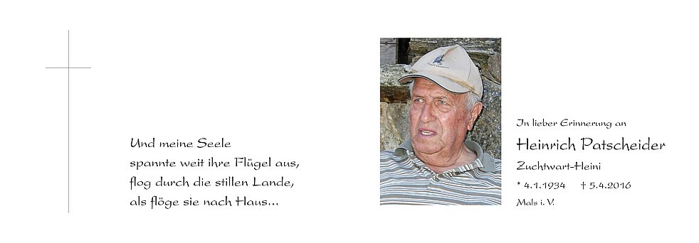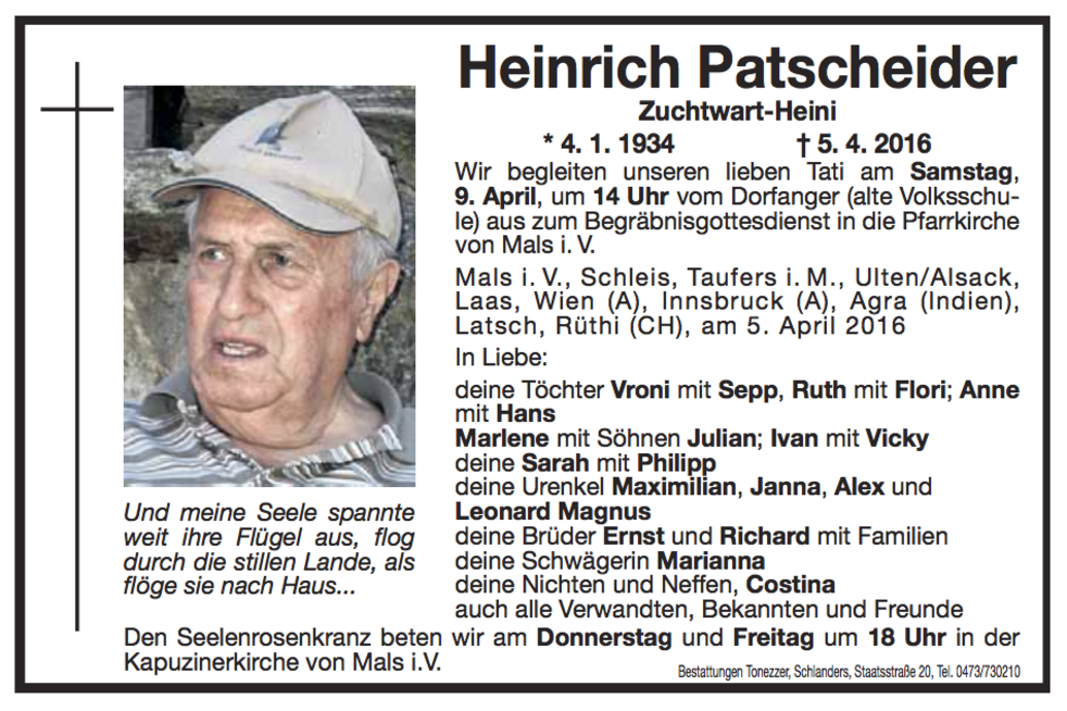 Wir begleiten unseren lieben Tati am Samstag, 9. April, um 14 Uhr vom Dorfanger (alte Volksschule) aus zum Begräbnisgottesdienst in die Pfarrkirche von Mals i.V.