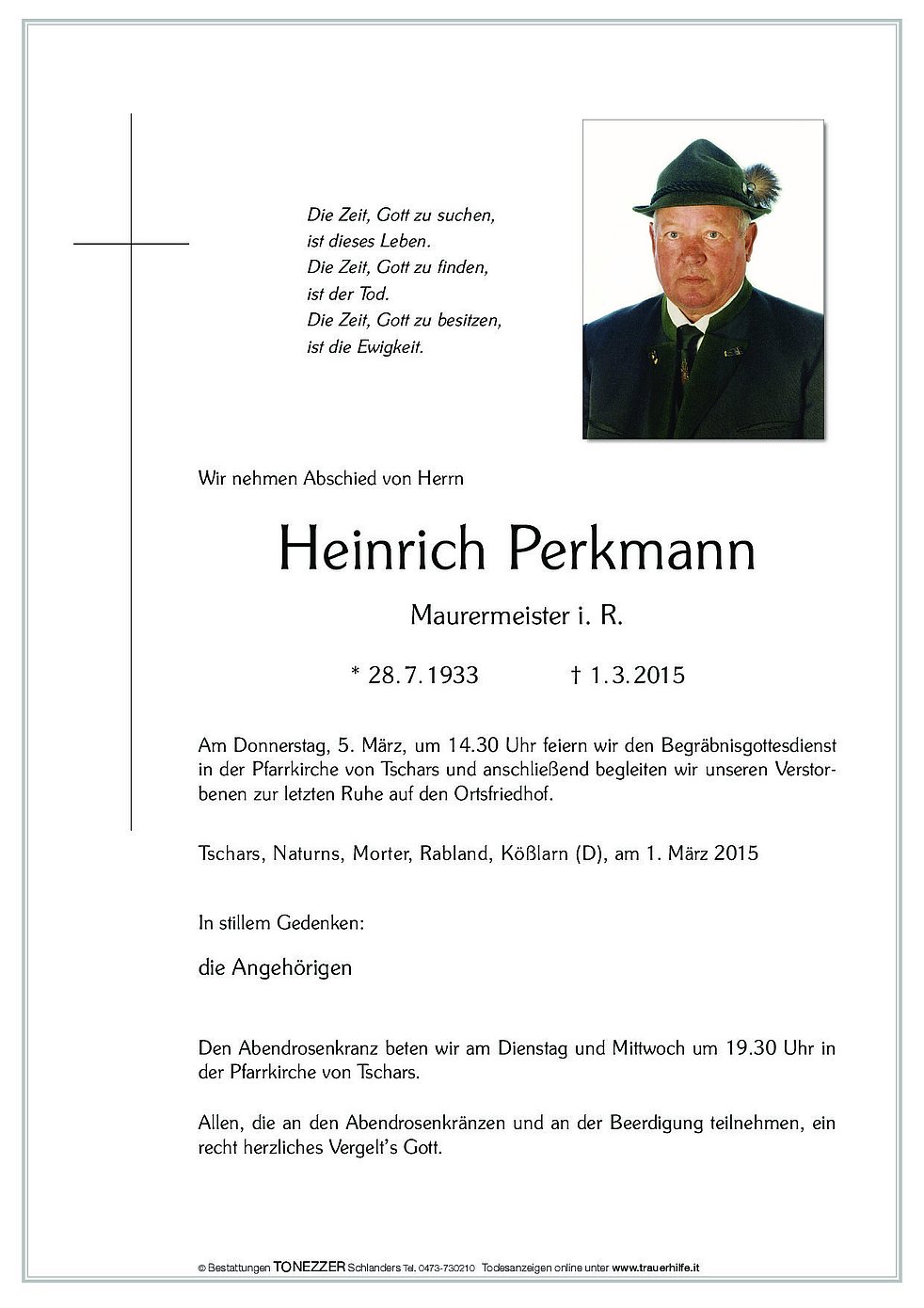 Am Donnerstag, 5. März, um 14.30 Uhr feiern wir den Begräbnisgottesdienst in der Pfarrkirche von Tschars und anschließend begleiten wir unseren Verstorbenen zur letzten Ruhe auf den Ortsfriedhof.