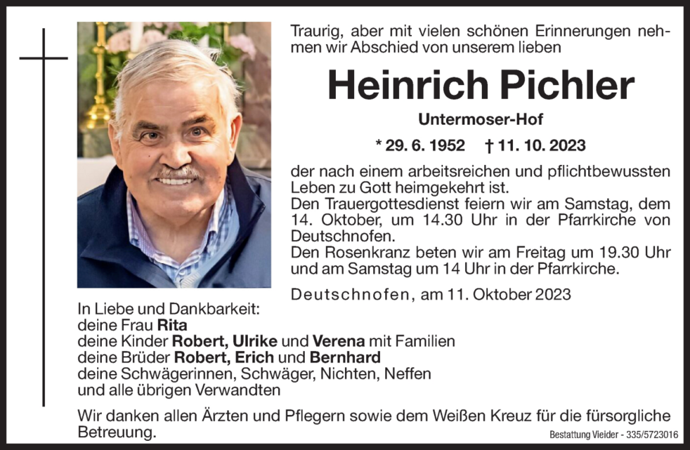 Den Trauergottesdienst feiern wir am Samstag, dem 14. Oktober, um 14.30 Uhr in der Pfarrkirche von Deutschnofen.
