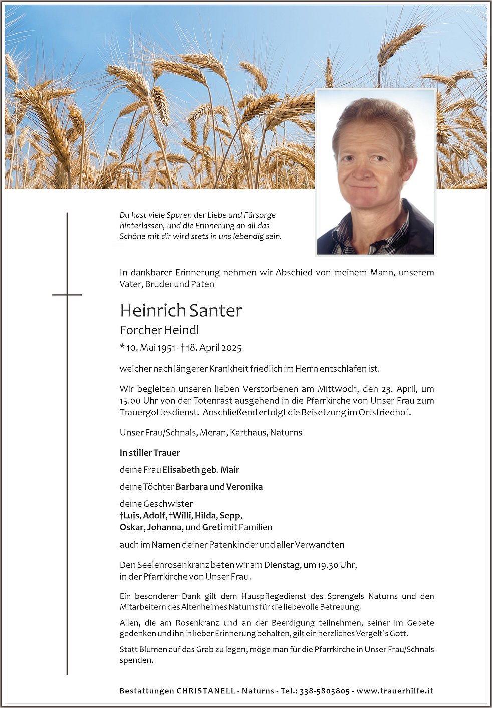 Wir begleiten unseren lieben Verstorbenen am Mittwoch, den 23. April, um 15.00 Uhr von der Totenrast ausgehend in die Pfarrkirche von Unser Frau zum Trauergottesdienst. Anschließend erfolgt die Beisetzung im Ortsfriedhof.