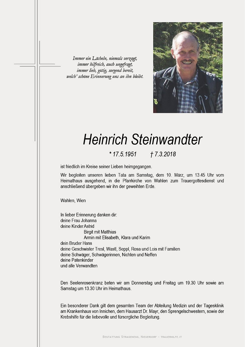 Wir begleiten unseren lieben Tata am Samstag, dem 10. März, um 13.45 Uhr vom Heimathaus ausgehend, in die Pfarrkirche von Wahlen zum Trauergottesdienst und anschließend übergeben wir ihn der geweihten Erde.