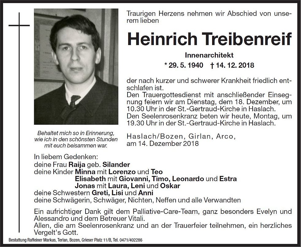 Den Trauergottesdienst mit anschlieβender Einsegnung feiern wir am Dienstag, dem 18. Dezember, um 10.30 Uhr in der St. Gertraud-Kirche in Haslach.