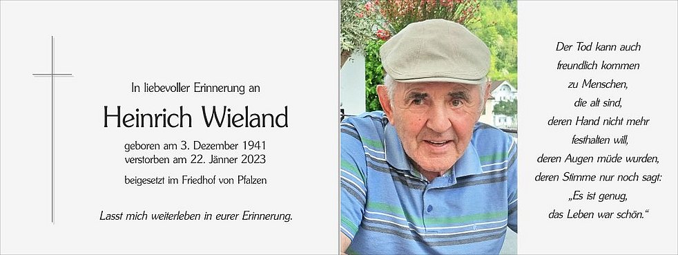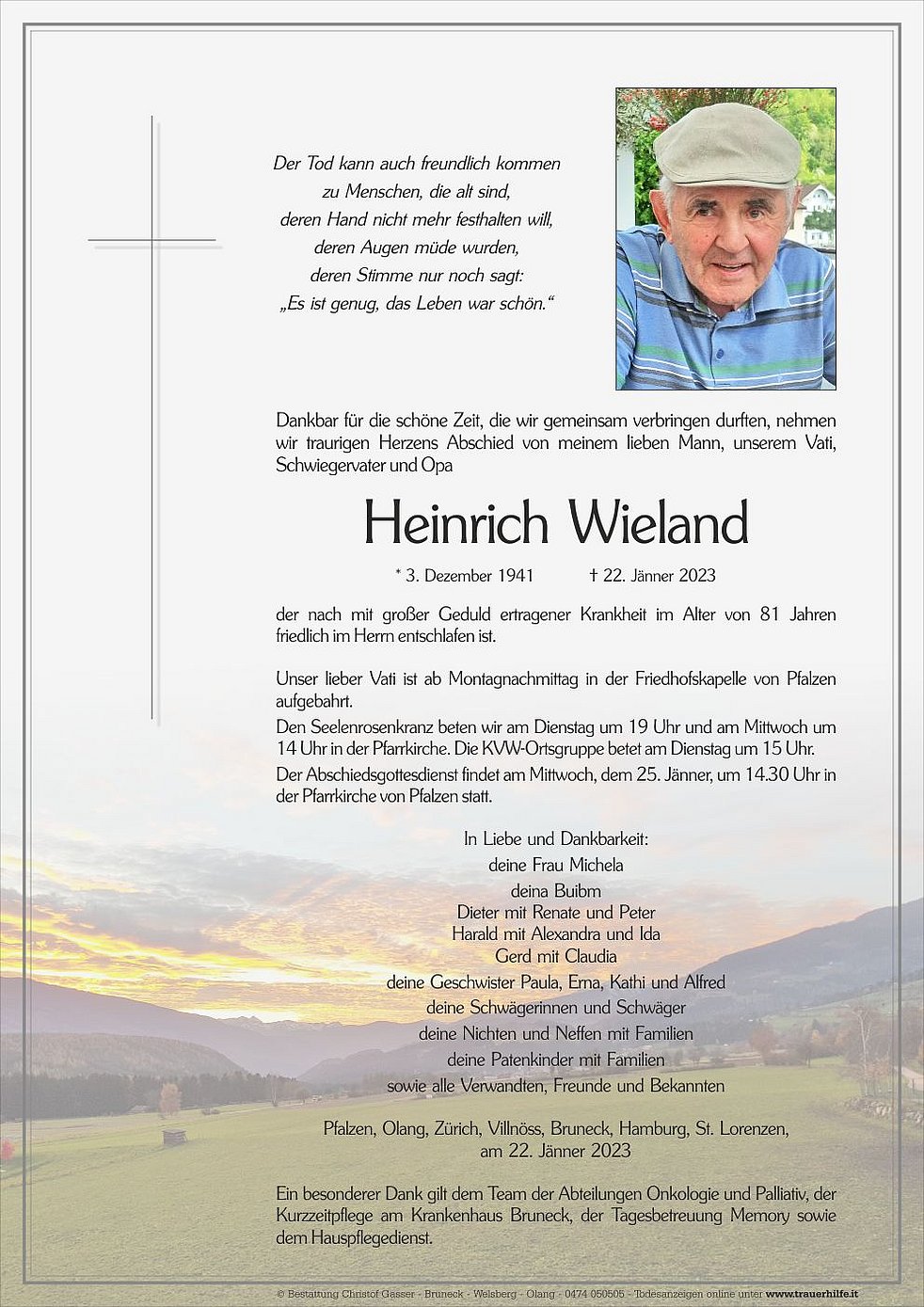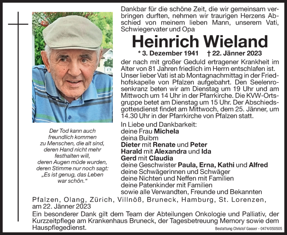 Der Abschiedsgottesdienst findet am Mittwoch, dem 25. Jänner, um 14.30 Uhr in der Pfarrkirche von Pfalzen statt.