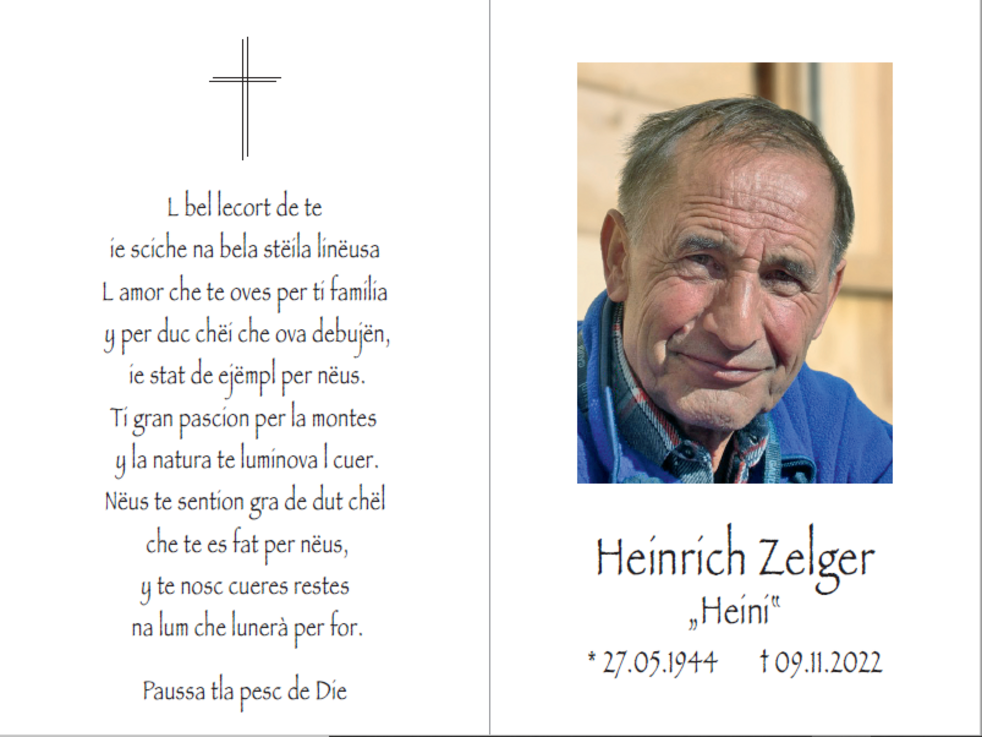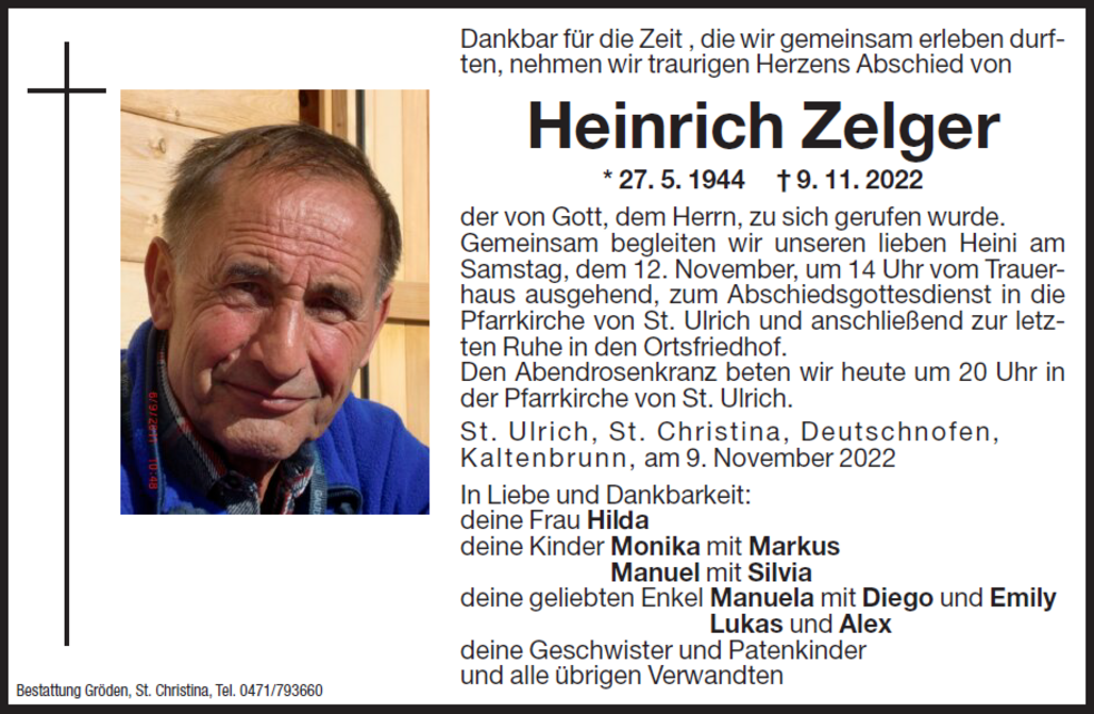 Gemeinsam begleiten wir unseren lieben Heini am Samstag, dem 12. November, um 14 Uhr vom Trauerhaus ausgehend, zum Abschiedsgottesdienst in die Pfarrkirche von St. Ulrich und anschließend zur letzten Ruhe in den Ortsfriedhof.
