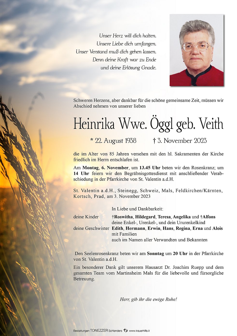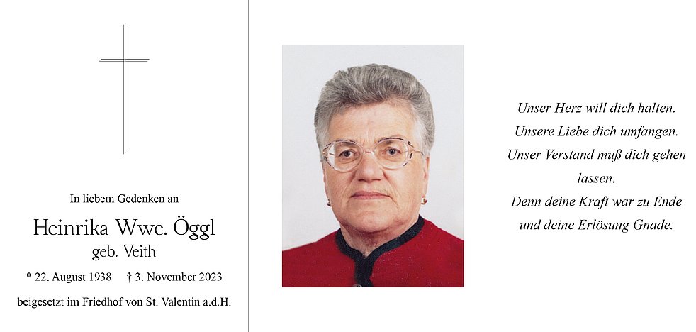 Am Montag, 6. November, um 13.45 Uhr beten wir den Rosenkranz; um 14 Uhr feiern wir den Begräbnisgottesdienst mit anschließender Verabschiedung in der Pfarrkirche von St. Valentin a.d.H.