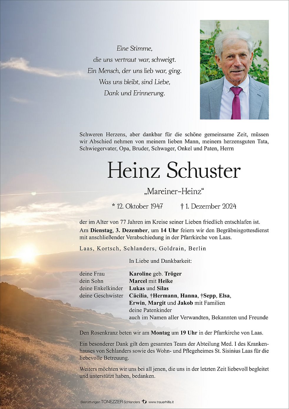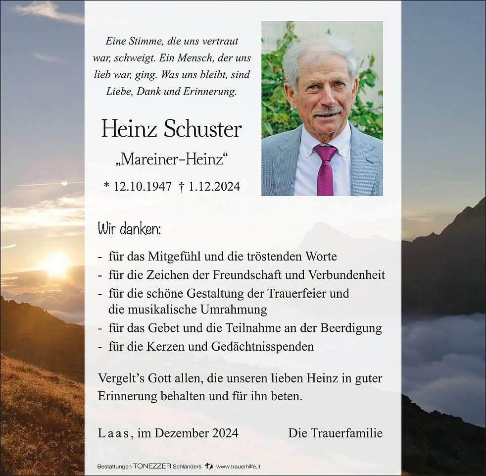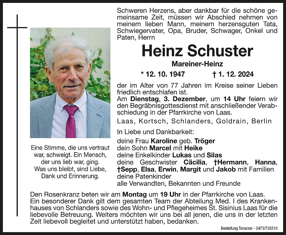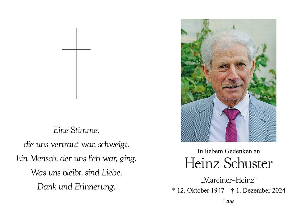Am Dienstag, 3. Dezember, um 14 Uhr feiern wir den Begräbnisgottesdienst mit anschließender Verabschiedung in der Pfarrkirche von Laas.
