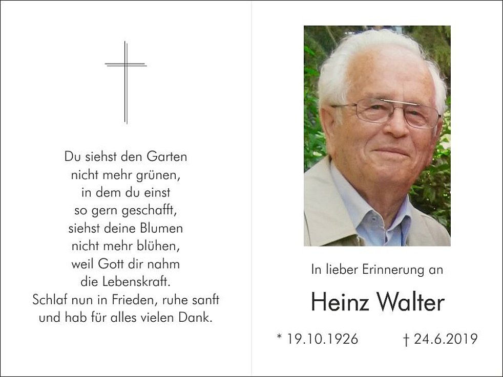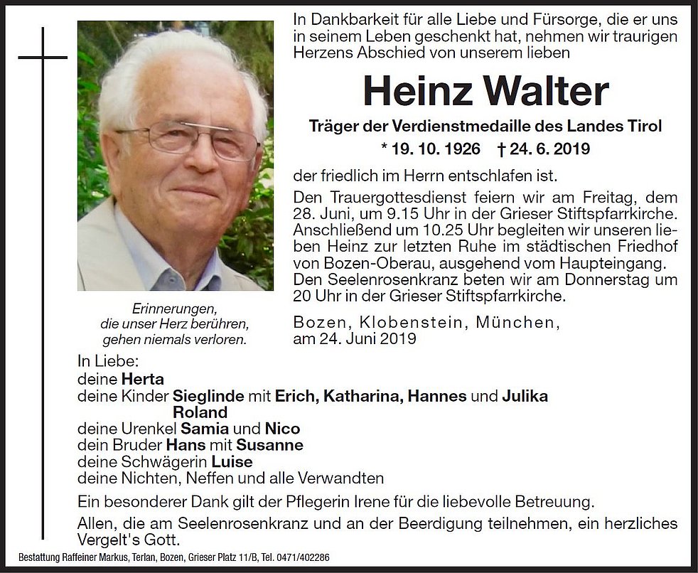 Den Trauergottesdienst feiern wir am Freitag, dem 28. Juni, um 9.15 Uhr in der Grieser Stiftspfarrkirche. Anschlieβend um 10.25 Uhr begleiten wir unseren lieben Heinz zur letzten Ruhe im städtischen Friedhof von Bozen-Oberau, ausgehend vom Haupteingang.