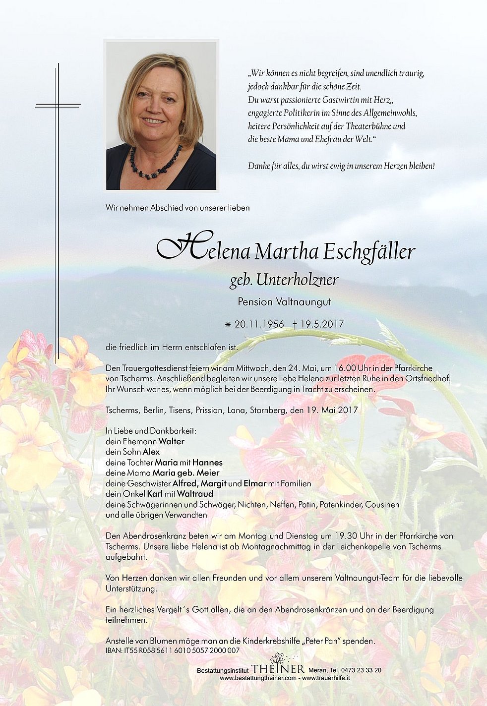 Den Trauergottesdienst feiern wir am Mittwoch, den 24. Mai um 16.00 Uhr in der Pfarrkirche von Tscherms. Anschließend begleiten wir unsere liebe Helena zur letzten Ruhe in den Ortsfriedhof.