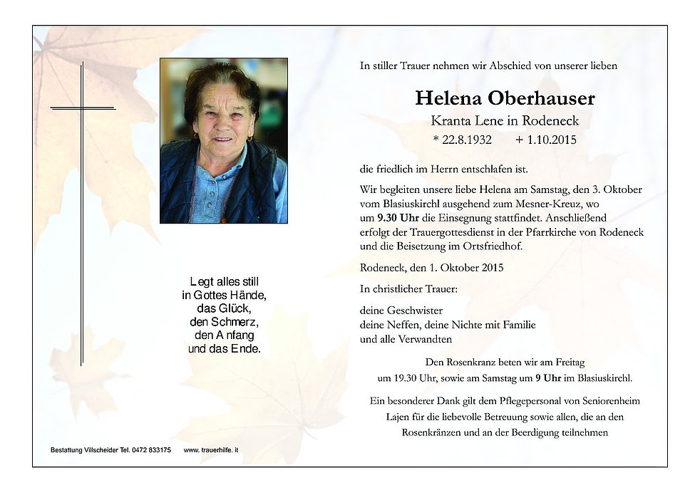 Ein besonderer Dank gilt dem Pflegepersonal von Seniorenheim Lajen für die liebevolle Betreuung sowie allen, die an den Rosenkränzen und an der Beerdigung teilnehmen