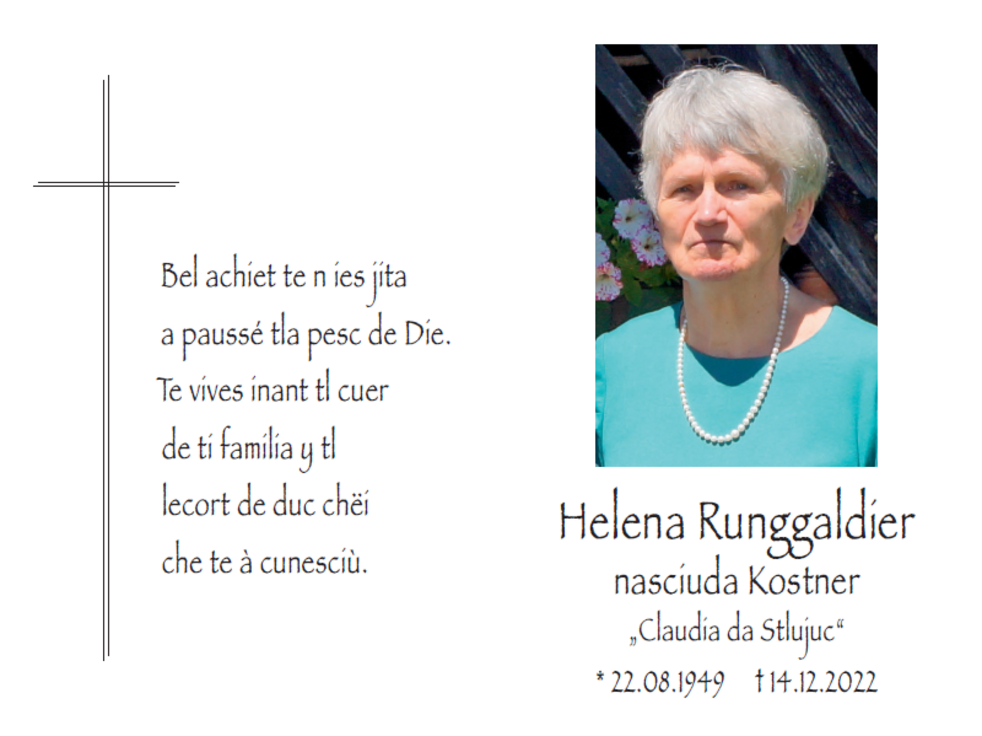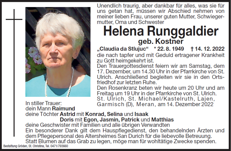 Den Trauergottesdienst feiern wir am Samstag, dem 17. Dezember, um 14.30 Uhr in der Pfarrkirche von St. Ulrich. Anschließend begleiten wir sie in den Ortsfriedhof zur letzten Ruhe.