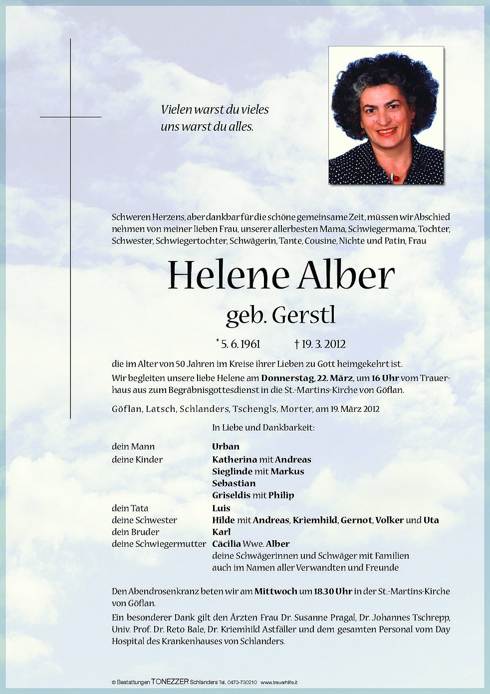 Wir begleiten unsere liebe Helene am Donnerstag, 22. März, um 16 Uhr vom Trauerhaus aus zum Begräbnisgottesdienst in die St.-Martins-Kirche von Göflan.