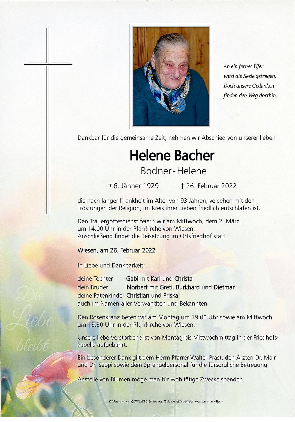 Den Trauergottesdienst feiern wir am Mittwoch, dem 2. März, um 14.00 Uhr in der Pfarrkirche von Wiesen. Anschließend findet die Beisetzung im Ortsfriedhof statt.