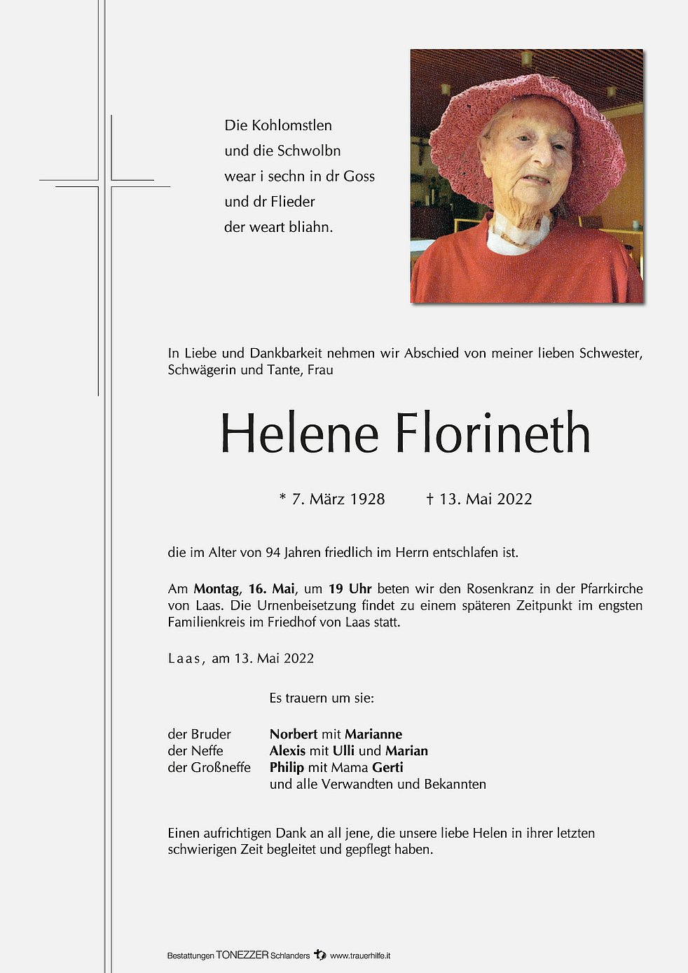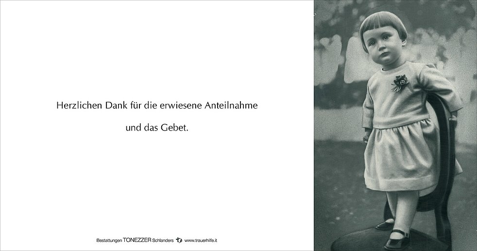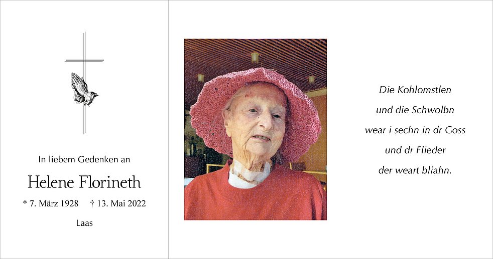Die Urnenbeisetzung findet zu einem späteren Zeitpunkt im engsten Familienkreis am Friedhof von Laas statt.