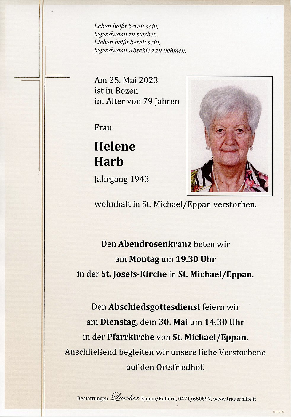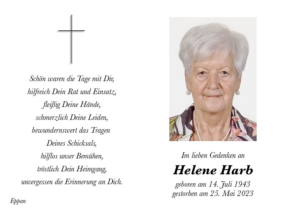 Den Abschiedsgottesdienst feiern wir am Dienstag, 30. Mai um 14.30 Uhr in der Pfarrkirche von St. Michael/Eppan. Anschließend begleiten wir unsere liebe Verstorbene auf den Ortsfriedhof.
