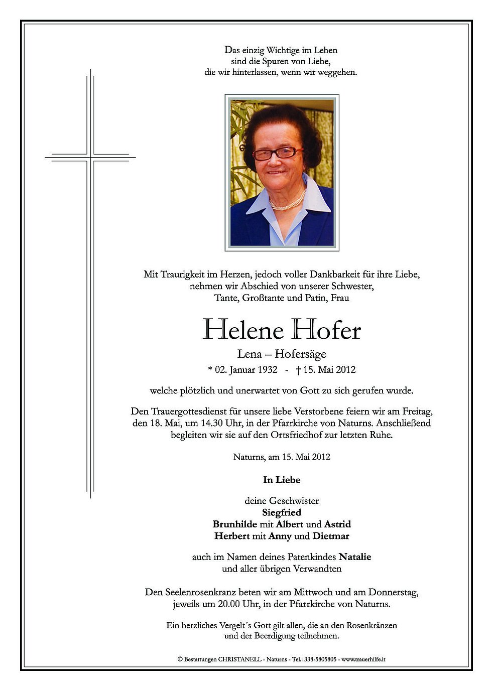 Den Trauergottesdienst für unsere liebe Verstorbene feiern wir am Freitag, den 18. Mai, um 14.30 Uhr, in der Pfarrkirche von Naturns. Anschließend begleiten wir sie auf den Ortsfriedhof zur letzten Ruhe.