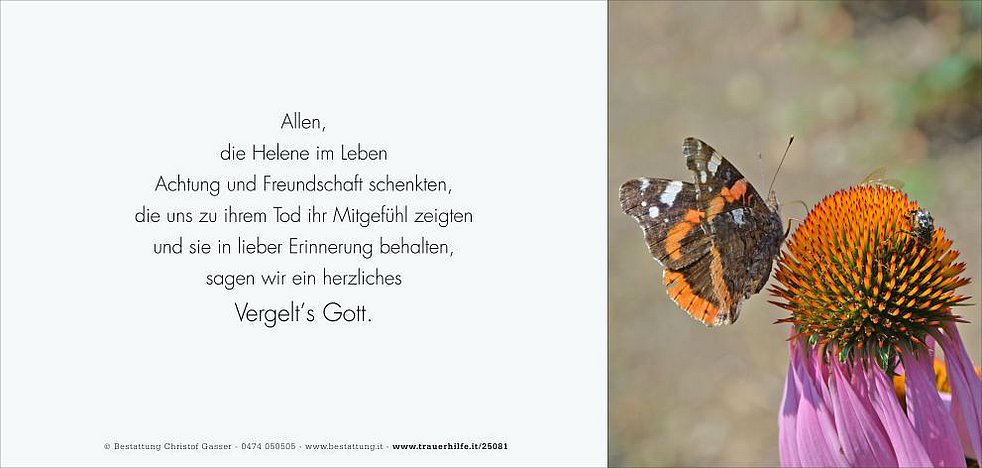 Ein besonderer Dank gilt der langjährigen Begleiterin Jutta, der Hausärztin Frau Dr. Astride Bonura, den Sprengelschwestern, allen vom Hauspflegedienst und den behandelnden Ärzten am Krankenhaus Bruneck.