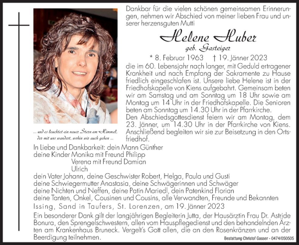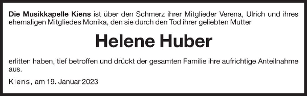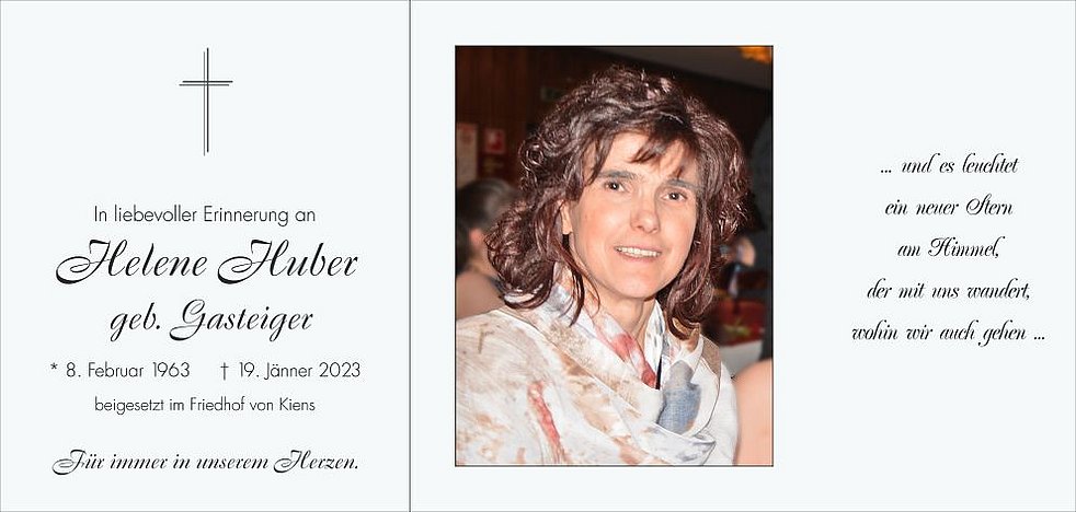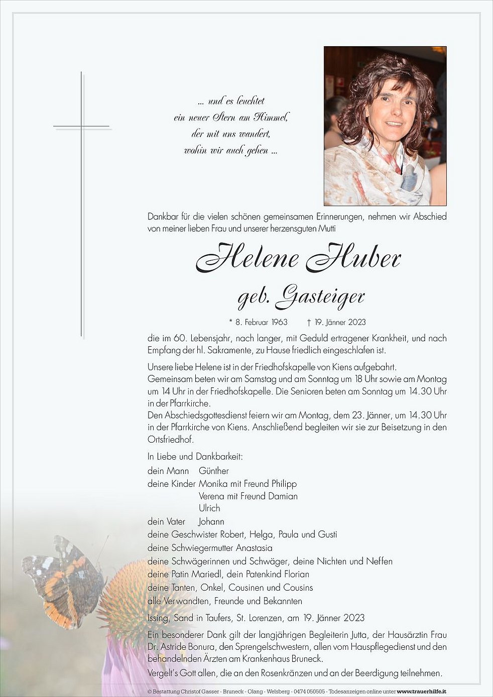Den Abschiedsgottesdienst feiern wir am Montag, dem 23. Jänner, um 14.30 Uhr in der Pfarrkirche von Kiens. Anschließend begleiten wir sie zur Beisetzung in den Ortsfriedhof.