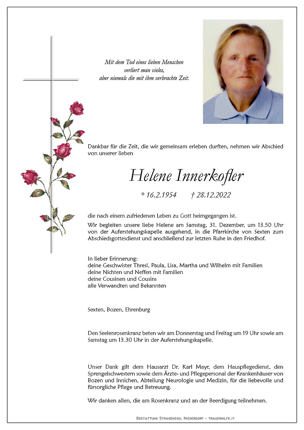Wir begleiten unsere liebe Helene am Samstag, 31. Dezember, um 13.50 Uhr von der Auferstehungskapelle ausgehend, in die Pfarrkirche von Sexten zum Abschiedsgottesdienst und anschließend zur letzten Ruhe in den Friedhof.