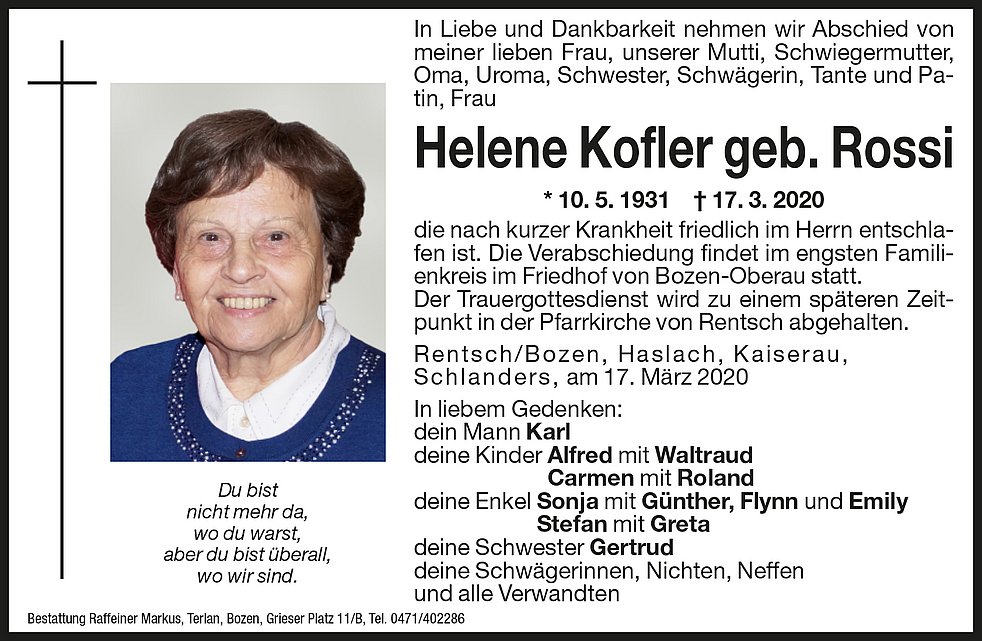 Die Verabschiedung findet im engsten Familienkreis im Friedhof von Bozen-Oberau statt.