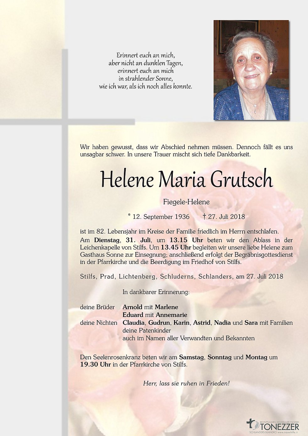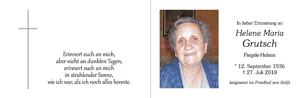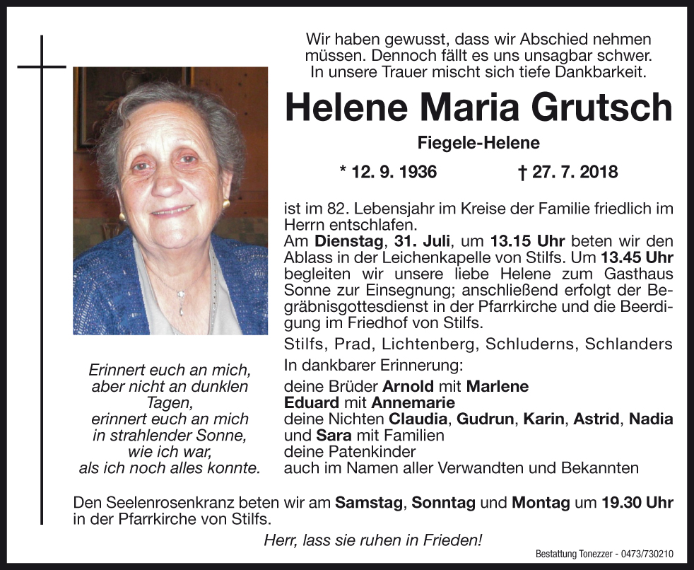 Am Dienstag, 31. Juli, um 13.15 Uhr beten wir den Ablass in der Leichenkapelle von Stilfs. Um 13.45 Uhr begleiten wir unsere liebe Helene zum Gasthaus Sonne zur Einsegnung; anschließend erfolgt der Begräbnisgottesdienst in der Pfarrkirche und die Beerdigung im Friedhof von Stilfs.