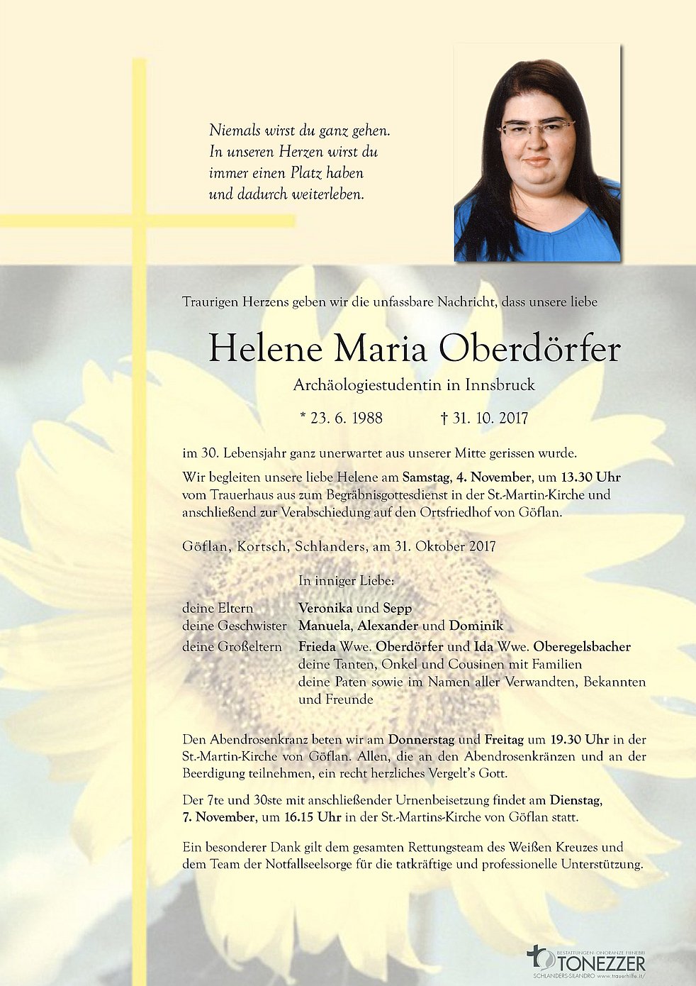 Der 7te und 30ste mit anschließender Urnenbeisetzung findet am Dienstag, 7. November, um 16.15 Uhr in der St.-Martins-Kirche von Göflan statt.