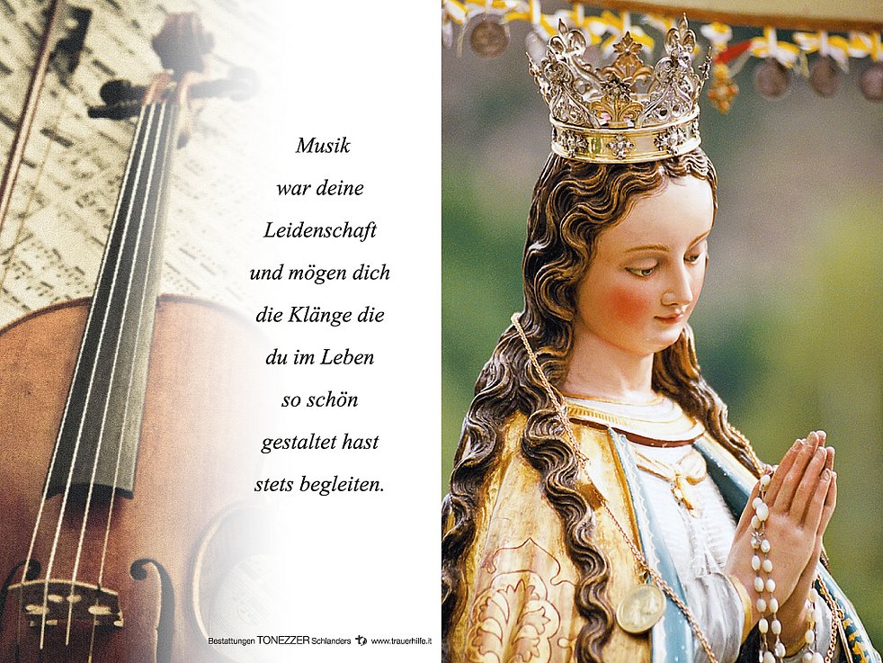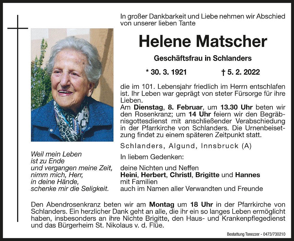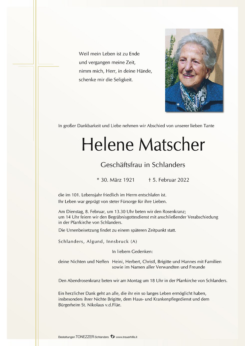 Am Dienstag, 8. Februar, um 13.30 Uhr beten wir den Rosenkranz; um 14 Uhr feiern wir den Begräbnisgottesdienst mit anschließender Verabschiedung in der Pfarrkirche von Schlanders.