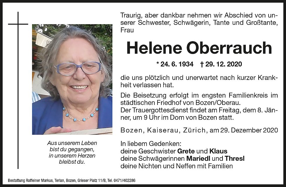 Die Beisetzung erfolgt im engsten Familienkreis im städtischen Friedhof von Bozen/Oberau.