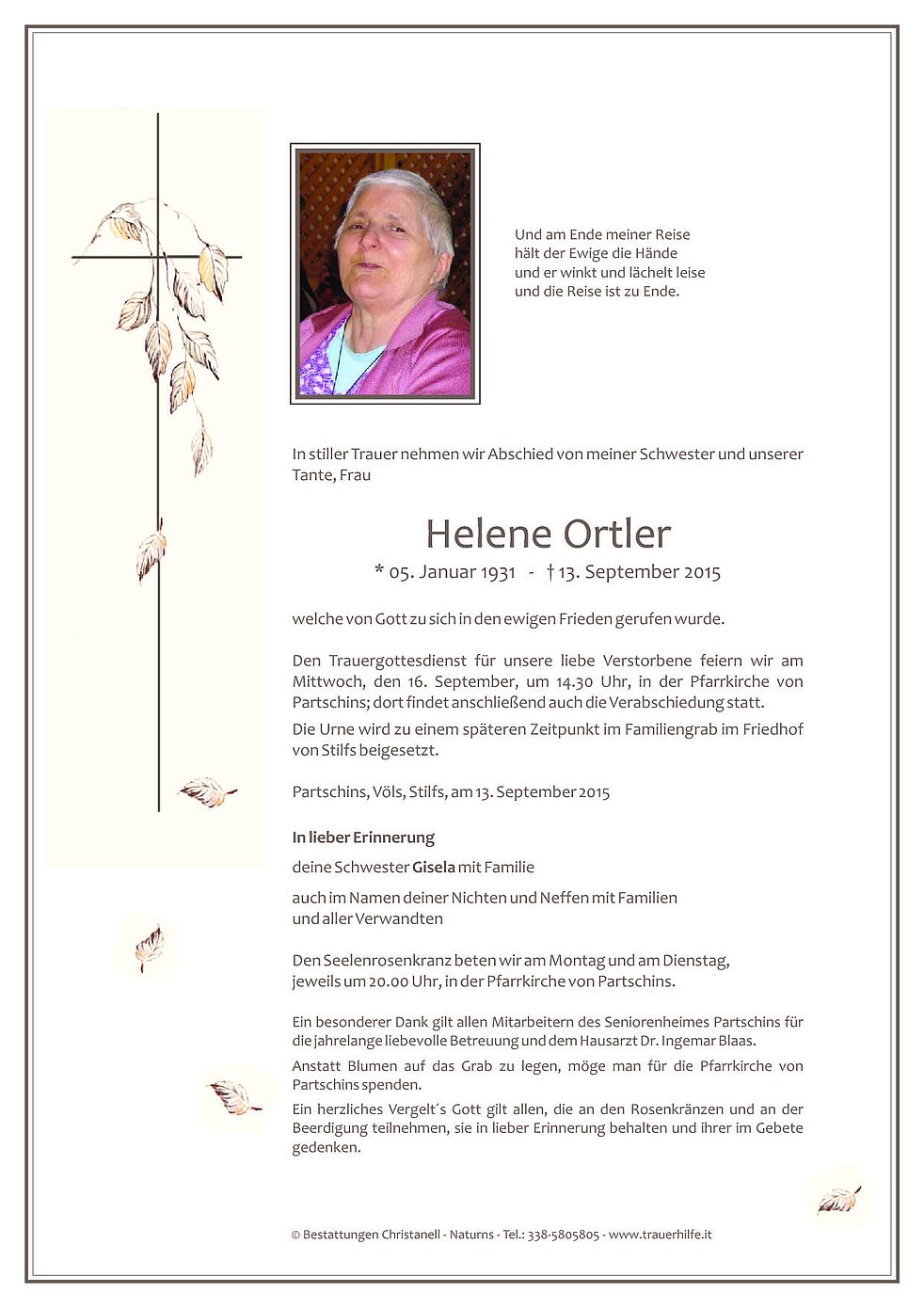 Den Trauergottesdienst für unsere liebe Verstorbene feiern wir am Mittwoch, den 16. September, um 14.30 Uhr, in der Pfarrkirche von Partschins; dort findet anschließend auch die Verabschiedung statt.