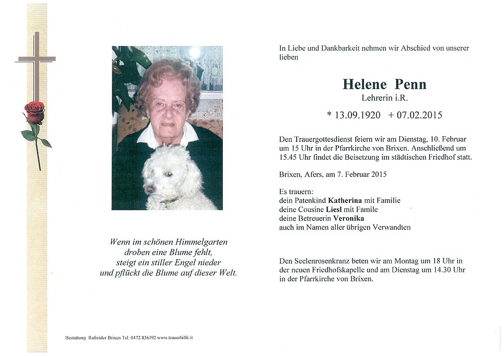 Gedankt sei dem Hausarzt Dr. Walter Niederstätter, dem Hauspflegedienst Brixen für die liebevolle Betreuung sowie allen, die ihr in den letzen Jahren beigestanden sind und an den Rosenkränzen und an der Beerdigung teilnehmen.