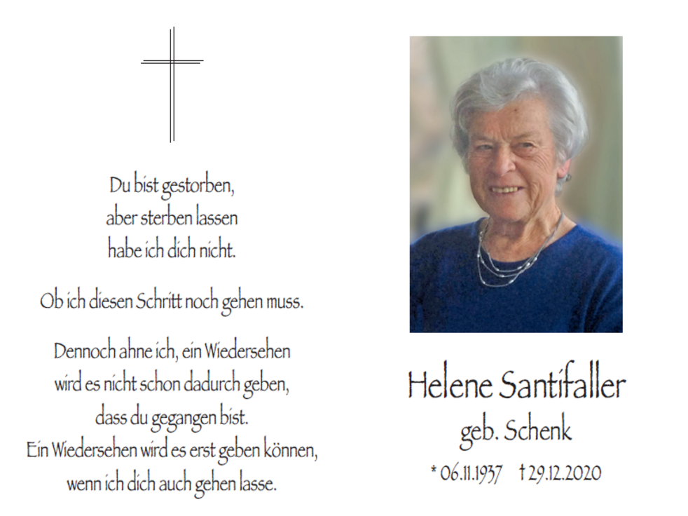 Den Trauergottesdienst mit anschließender Verabschiedung feiern wir am Donnerstag, dem 31. Dezember, um 14.30 Uhr in der Pfarrkirche von St. Ulrich. Die Urne wird nach erfolgter Einäscherung im Kreise der Familie im Ortsfriedhof beigesetzt.