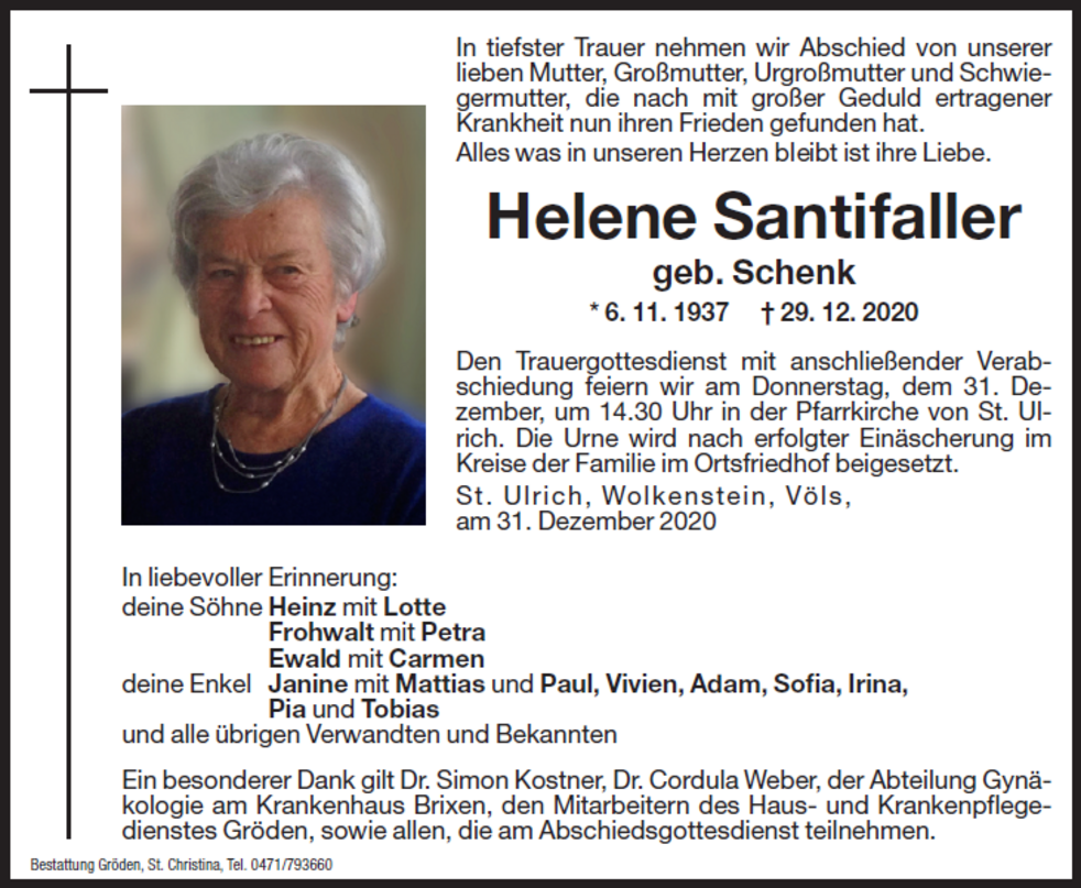 Ein besonderer Dank gilt Dr. Simon Kostner, Dr. Cordula Weber, der Abteilung Gynäkologie am Krankenhaus Brixen, den Mitarbeitern des Haus- und Krankenpflegedienstes Gröden, sowie allen, die am Rosenkranz und am Abschiedsgottesdienst teilnehmen.