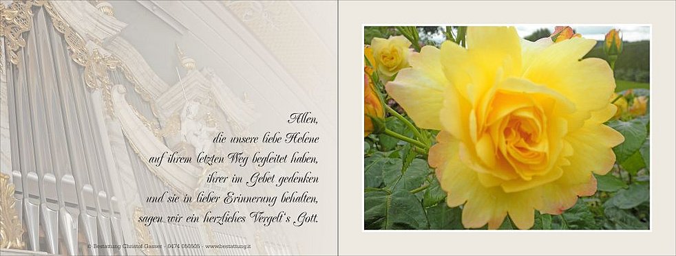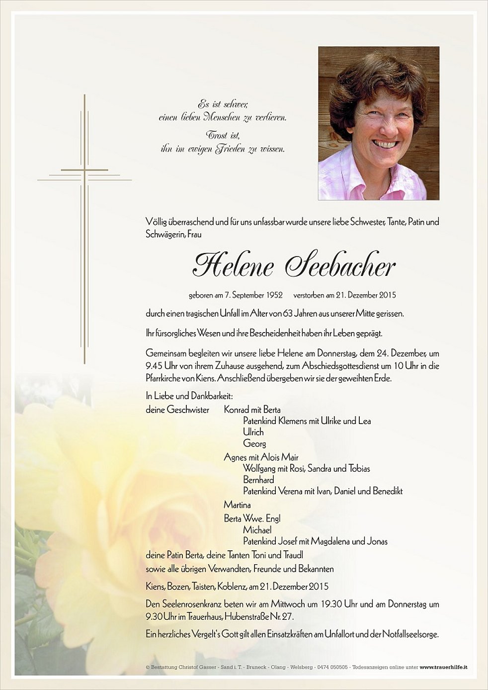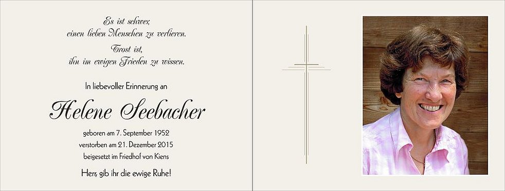 Gemeinsam begleiten wir unsere liebe Helene am Donnerstag, dem 24. Dezember, um 9.45 Uhr von ihrem Zuhause ausgehend, zum Abschiedsgottesdienst um 10 Uhr in die Pfarrkirche von Kiens. Anschließend übergeben wir sie der geweihten Erde.