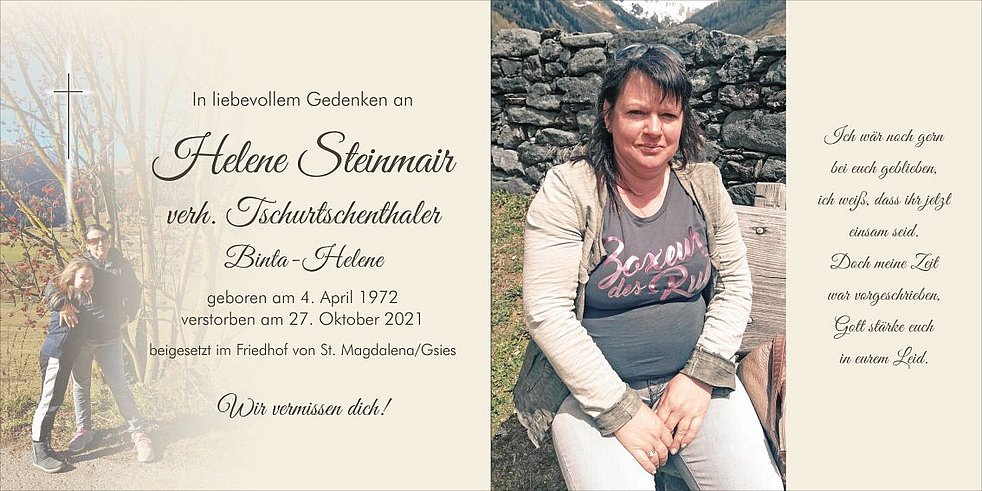 Den Trauergottesdienst feiern wir am Samstag, dem 30. Oktober, um 14 Uhr in der Pfarrkirche von St. Magdalena/Gsies.