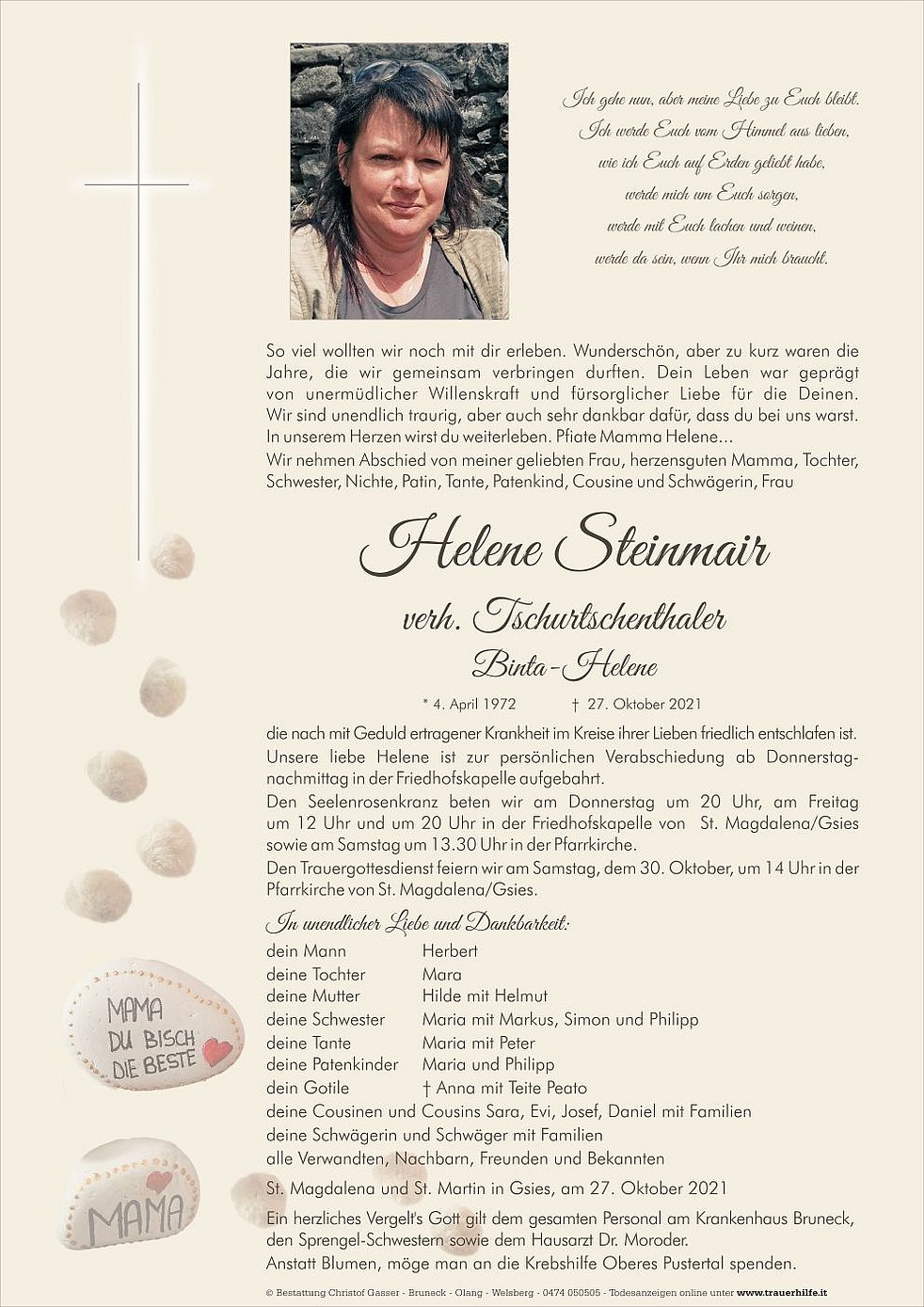 Wir sind unendlich traurig, aber auch sehr dankbar dafür, dass du bei uns warst. In unserem Herzen wirst du weiterleben. Pfiate Mamma Helene...