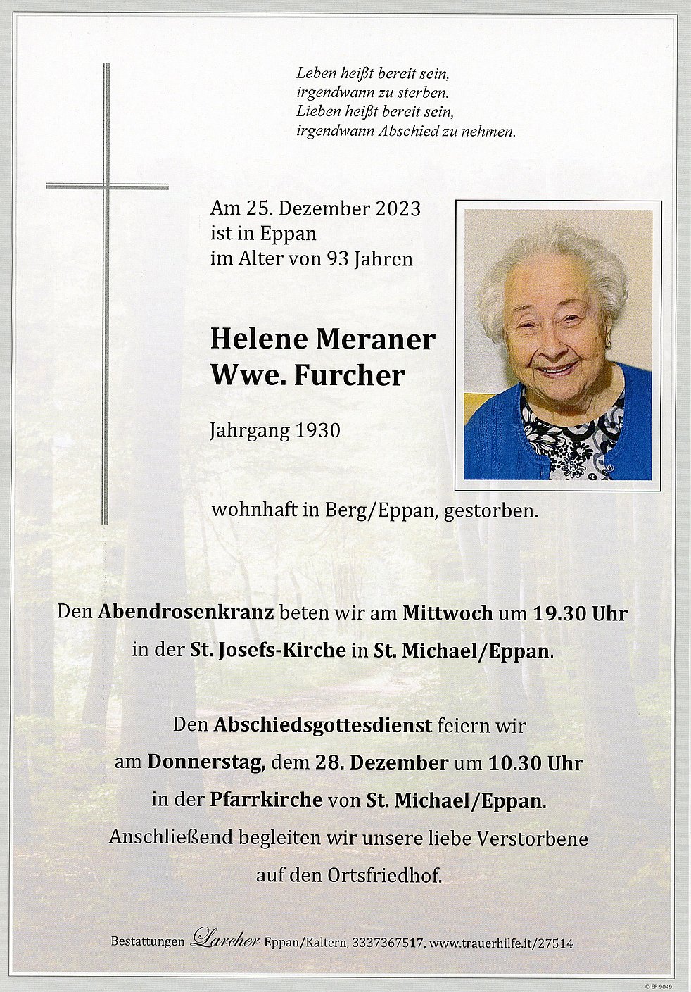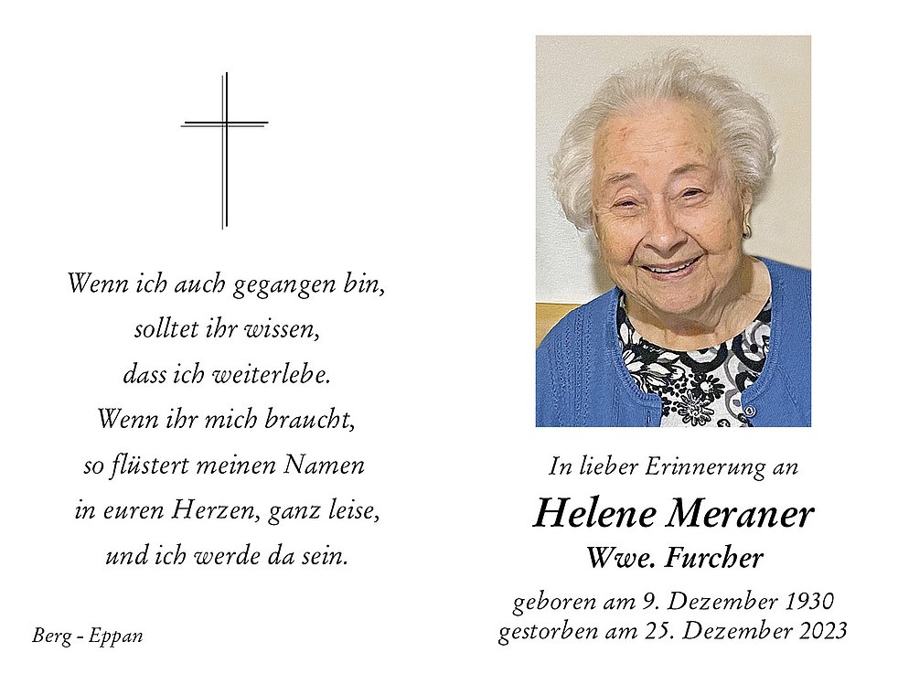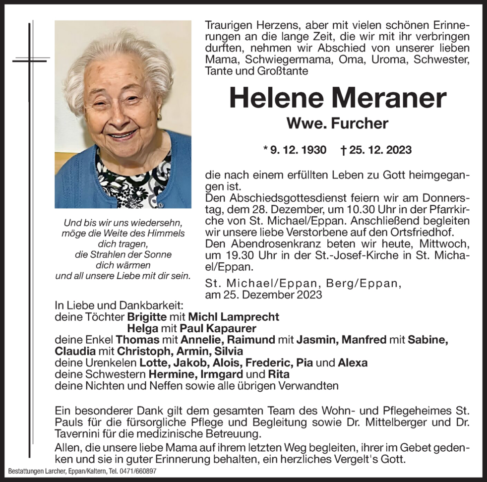 Den Abschiedsgottesdienst feiern wir am Donnerstag, dem 28. Dezember um 10.30 Uhr in der Pfarrkirche von St. Michael/Eppan. Anschließend begleiten wir unsere liebe Verstorbene auf den Ortsfriedhof.