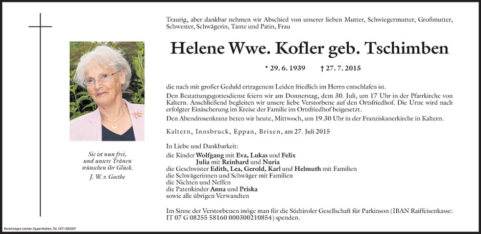 Im Sinne der Verstorbenen möge man an die Südtiroler Gesellschaft für Parkinson (IBAN Raiffeisenkasse: IT 07 G 08255 58160 000300210854) spenden.