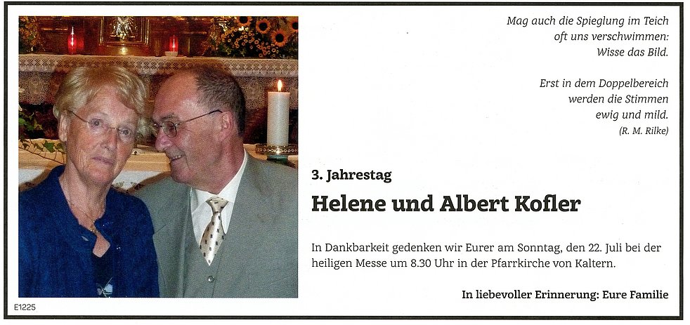 Den Bestattungsgottesdienst feiern wir am Donnerstag, dem 30. Juli, um 17 Uhr in der Pfarrkirche von Kaltern. Anschließend begleiten wir unsere liebe Verstorbene auf den Ortsfriedhof. Die Urne wird nach erfolgter Einäscherung im Kreise der Familie im Ortsfriedhof beigesetzt.