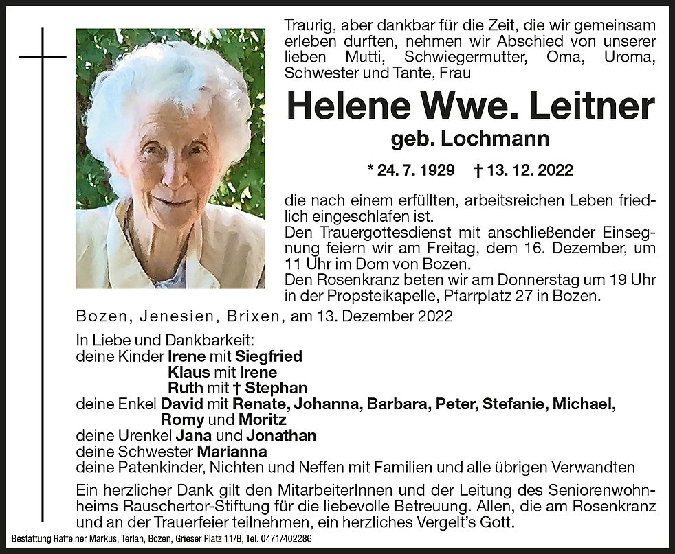 Den Trauergottesdienst mit anschließender Einsegnung feiern wir am Freitag, dem 16. Dezember, um 11 Uhr im Dom von Bozen.