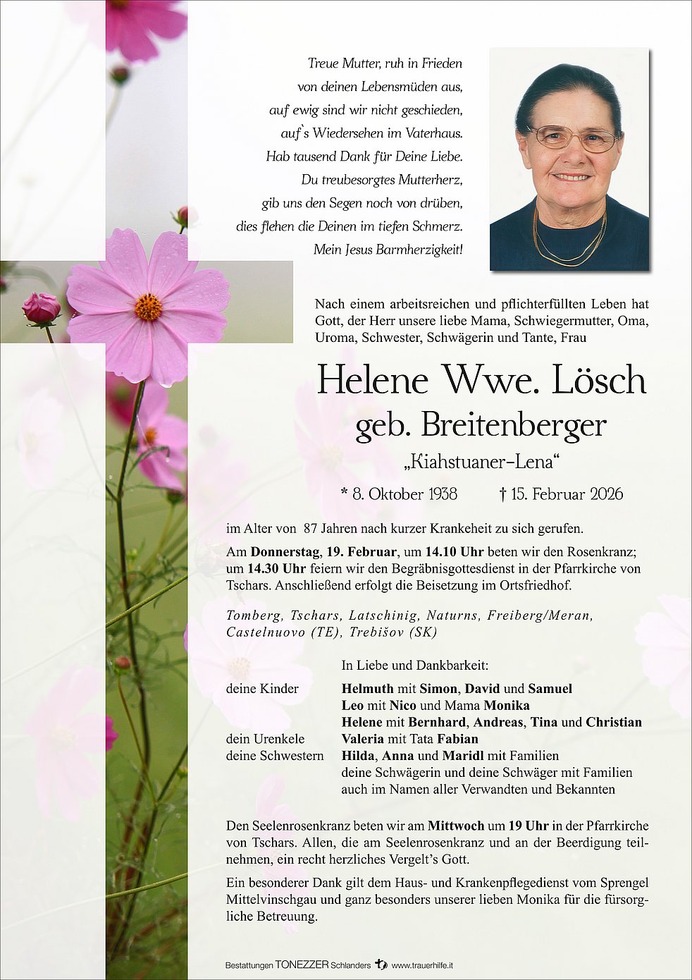 Am Donnerstag, 19. Februar, um 14.10 Uhr beten wir den Rosenkranz; um 14.30 Uhr feiern wir den Begräbnisgottesdienst in der Pfarrkirche von Tschars. Anschließend erfolgt die Beisetzung im Ortsfriedhof.