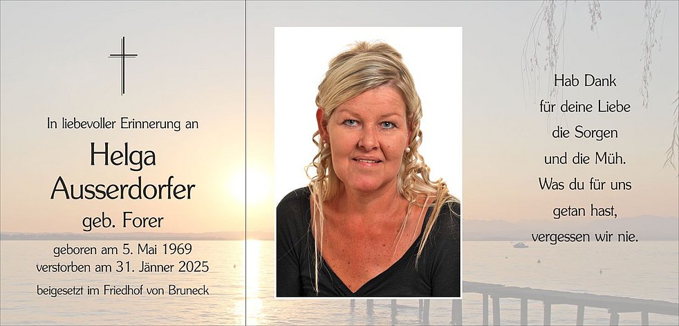 Unsere Helga ist zur persönlichen Verabschiedung ab Montagnachmittag in der Friedhofskapelle von Bruneck aufgebahrt.