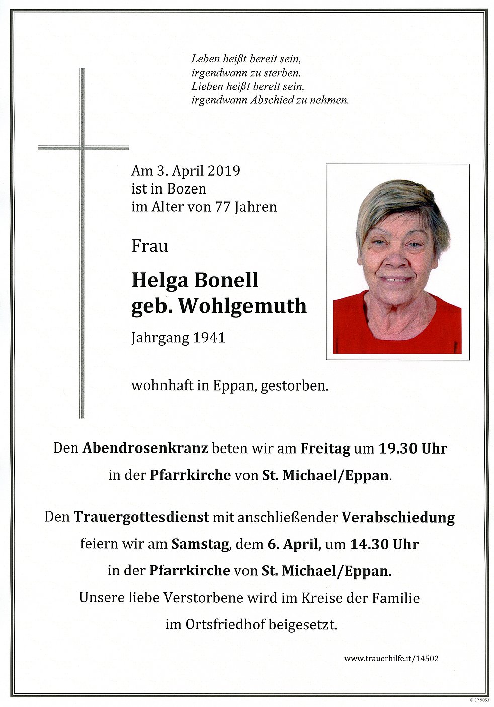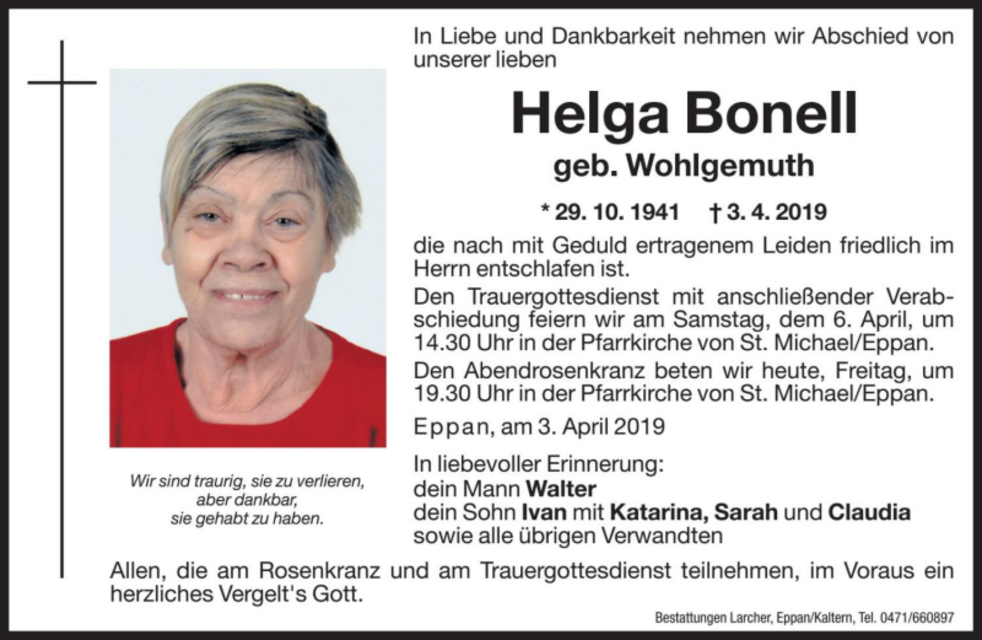 Den Trauergottesdienst mit anschließender Verabschiedung feiern wir am Samstag, dem 6. April um 14.30 Uhr in der Pfarrkirche von St. Michael/Eppan.